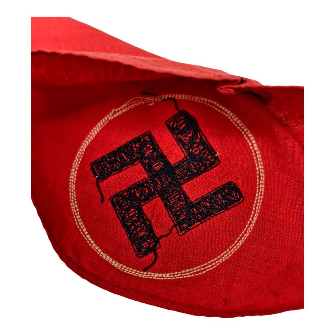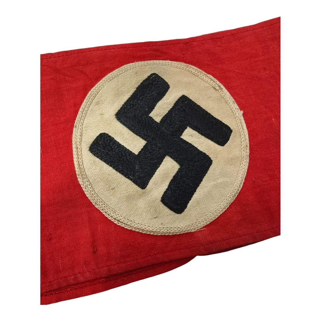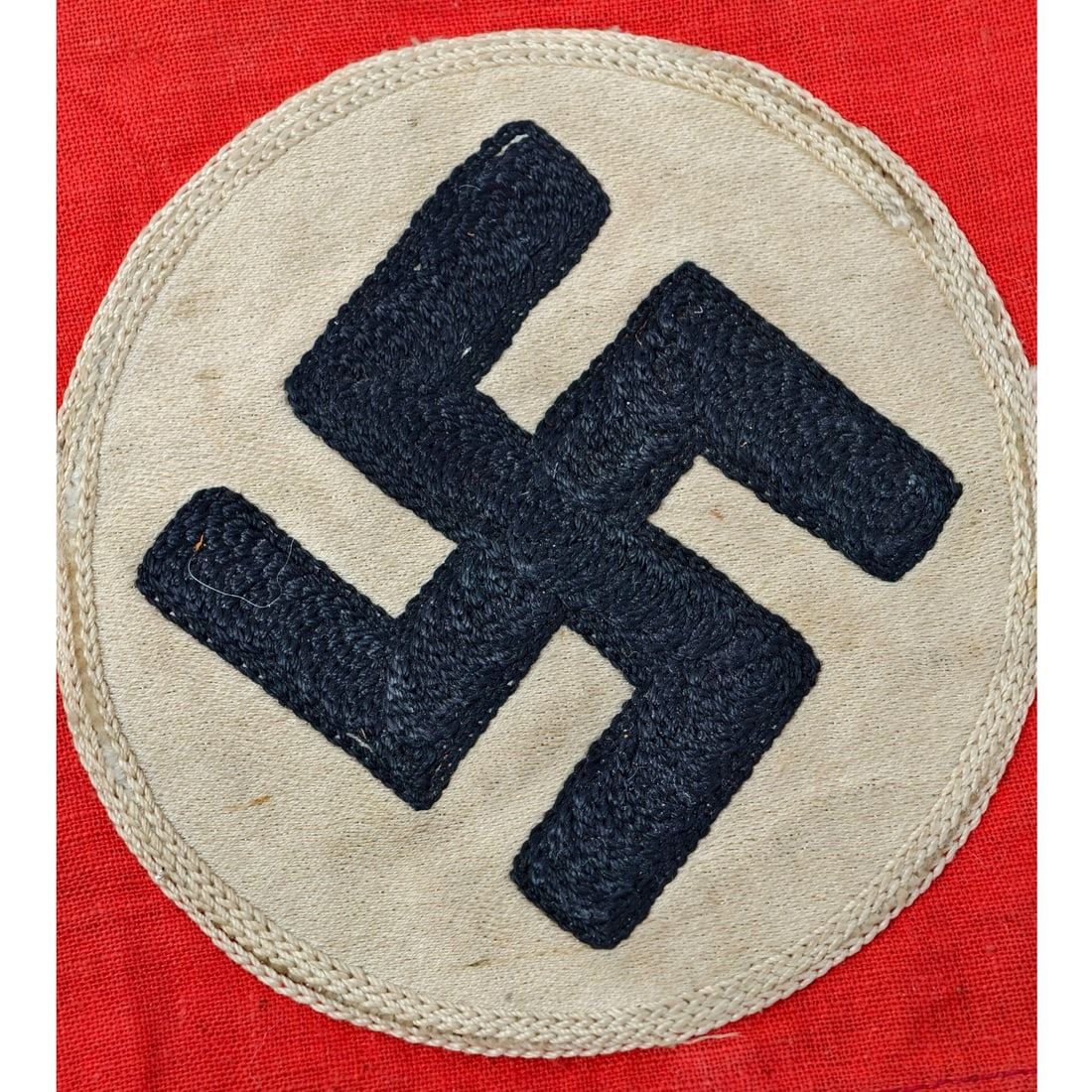 This chain stitched NSDAP Armband is a fantastic example of a seldom-seen and very desirable variant. These are vastly less common than the more often seen construction styles such as multi-piece, printed or woven. The body of this armband is made of a typical plain weave cotton or linen fabric that retains strong original color. A roundel of woven white fabric has been affixed to the front of the armband with rows of machine chain stitching. The center of the roundel has been emblazoned with a chain stitched black swastika emblem. The quality of the workmanship here is great, and this armband has exceptional eye appeal. The top and bottom edges of the armband are finished with straight machine stitching, and the reverse has been joined with a typical seam, with what looks to be an additional line of machine stitching intended to make this a little smaller for a custom fit to a uniform sleeve. This lovely chain stitched NSDAP armband shows very light traces of honest wear and very light age toning. There are no holes, rips or stains to note. The condition rates as near mint.