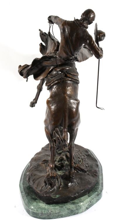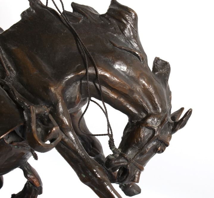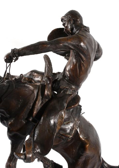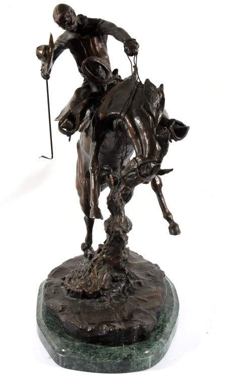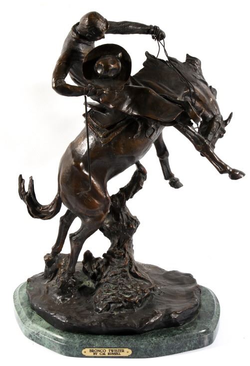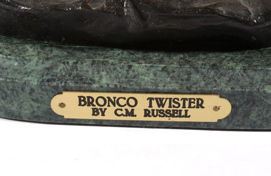 For your consideration in this lot we have a wonderful rare Charlie M. Russell bronze sculpture titled 'Bronco Twister'. Charles Marion Russell (March 19, 1864 – October 24, 1926), also known as C. M. Russell, Charlie Russell, and "Kid" Russell, was an artist of the Old American West. Russell created more than 2,000 paintings of cowboys, Indians, and landscapes set in the Western United States and in Alberta, Canada, in addition to bronze sculptures. Known as 'the cowboy artist', Russell was also a storyteller and author. This bronze depicts a bronco as it tries to unseat his rider. The bronze shows excellent detail across the piece with wonderful craftsmanship. The sculpture is set onto a marble base with a brass plaque reading "Bronco Twister By C.M. Russell" and the bronze is signed by Russell across the back. The bronze is in very good condition. It measures approximately 15 1/2" long by 11" wide and 24" tall. The bronze is shown on a marble plaque, the exact age is unknown.