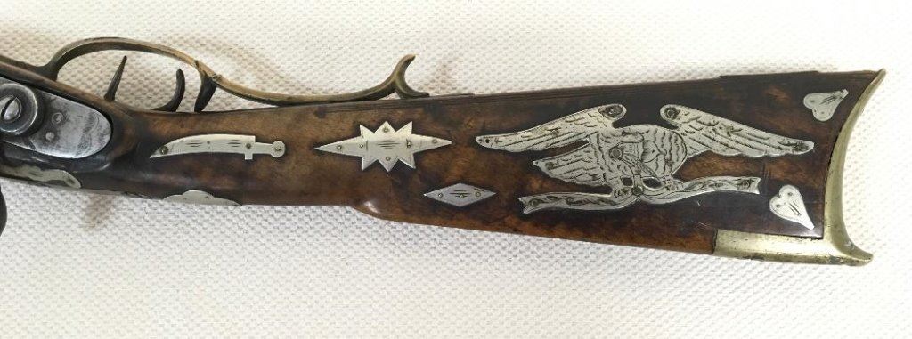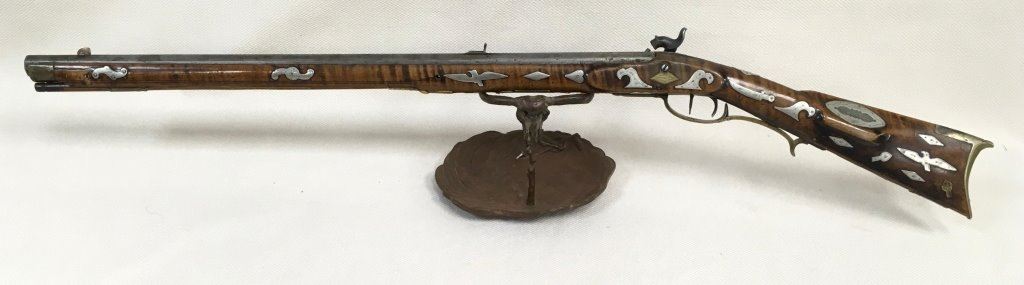 Rare Child’s Full Stock Percussion Rifle With Large Silver Eagle Plaque Inlay & 34 Other Silver Inlays Plus 3 Brass Inlays. Set Trigger. Cal.45 Date Early 1800’s
