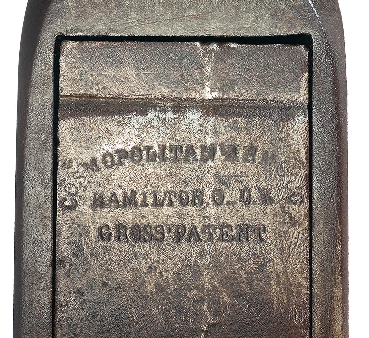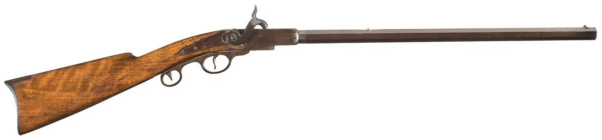 This rare Civil War carbine was manufactured by the Cosmopolitan Arms Company of Hamilton, Ohio. The company was owned by E. Gwyn and A.C. Campbell. These carbines were the predecessor of the Gwyn & Campbell "Grape Vine" carbine, manufactured from 1859 to 1862. This carbine is one of only about 50 Early Variant Models with the double loop enclosed lever with the locking latch for the breech inside the loop. The top of the breech block is marked "COSMOPOLITAN ARMS CO." in an arc above "HAMILTON O. U.S. / GROSS' PATENT". The matching serial number appears on the bottom of the barrel and frame at the breech. Mounted with a smooth straight grip stock with an iron buttplate.