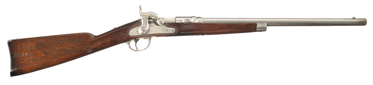 This exceedingly rare example of a Lindner beech-loading carbine was manufactured by Edward Lindner at the Amoskeag Manufacturing Company Armory in Manchester, New Hampshire circa 1861-1862. Lindner produced 501 First Model carbines that were issued to the 1st Michigan Cavalry and 8th West Virginia Mounted Infantry. The carbine is finished 'National Armory Bright" and has a oil-finished walnut stock. The top of the breechblock is stamped: "EDWARD LINDNER'S / PATENT. / MARCH 29, 1859" in three lines. The carbine has a sling ring on the left stock flat, a folding two-leaf rear sight on the receiver tang and a rotating collar device that turns 180 degrees to the left to release the breechblock. The left stock flat is stamped with the inspector's initials "G.K.J." in small block letters. The initials "W H" are carved in the right side of the stock near the butt.