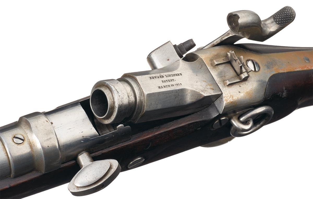 Condition: Very fine. The carbine has been lightly cleaned and the metal surfaces are bright with faint traces of scattered pitting handling marks. The Lindner patent markings on the breechblock are sharp. The stock is also in very fine condition with sharp edges and shows only minor handling wear. This is an exceptional example of a hard-to-find Civil War carbine.