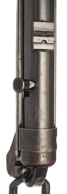 Very fine with 85% of the blue finish remaining overall with general light thinning and wear. The lower pistol grip panels and lower receiver cover have numerous light handling marks and scratches from field use. A very nice example of an real WWII German MP40 SMG. NOTE: This weapon is a restricted, National Firearms Act (NFA) Class 3, Fully Automatic Weapon, that is registered with the Bureau of Alcohol, Tobacco, Firearms and Explosives (BATF&E) under the provisions of 18 U.S.C. Chapter 44 and 27 CFR part 478. This weapon is currently registered as a "PRE-MAY 86 SALES SAMPLE" and as such can only be purchased by an FFL, with a Class 2 or Class 3 SOT License; individuals/companies without these types of Licenses, cannot purchase this weapon. Before bidding on this weapon is it the obligation and sole responsibility of the FFL holder to understand and comply with all the State and Federal transfer laws and restrictions that apply in their current place of residence.