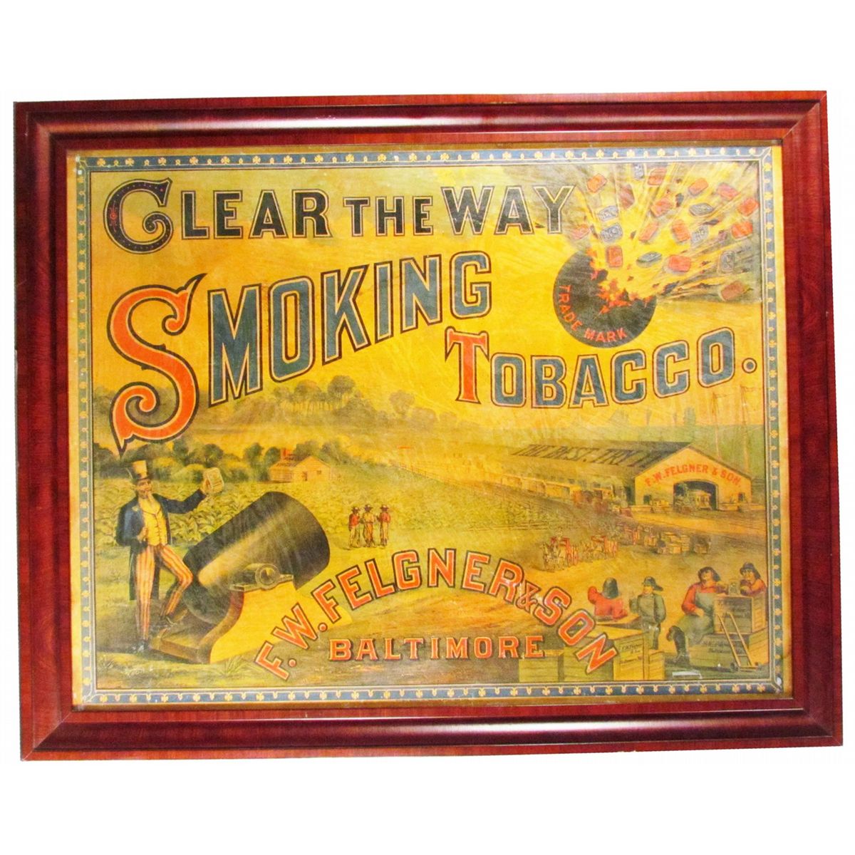 Rare "Clear the Way" Smoking Tobacco Paper Sign. F.W. Felgner & Son, Baltimore. Depicting Uncle Sam firing a cannon. Surface has been varnished long ago otherwise Very good condition. Framed in beautiful mahogany 31 X 25 inches overall.