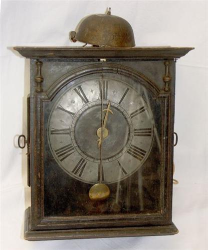 Belle et rare horloge à poids neuchâteloise, cadran en étain, chiffres romains gravés et peints en noir, échappement à verge, balancier devant «queue de vache», en très bon état, env. 1720
