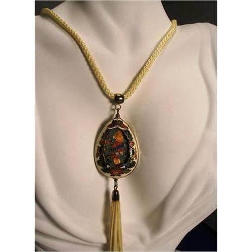 This is a rare exquisite Cloisonné? Pendant/ Necklace. The cloisonné art is on three levels, front,back and middle. The pendant measures 2 inches by 1&1/4 inch. The pendant is draped from an off white rope that measures 29 inches.