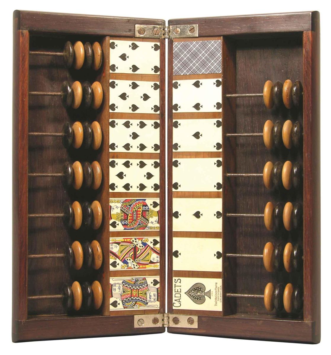 Rare Closed Back Faro Case keeper. Unknown maker but extremely well made. Mahogany dove tail frame with paper card faces and wood beads. Excellent original condition. 11 1/4 X 11 1/4 inches.