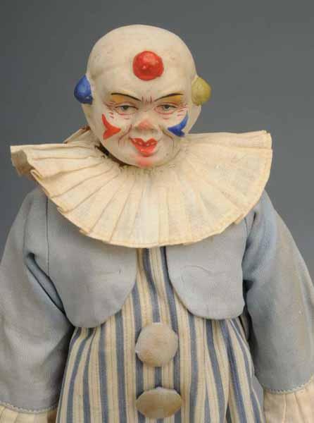 Description Germany, Ca. 1890. Papier-Mache character head with wonderful modeling and clown painting, cloth body, composition hands (finger off but included), original cotton clown costume, replaced vintage shoes. Condition (Excellent). Size 13" T.