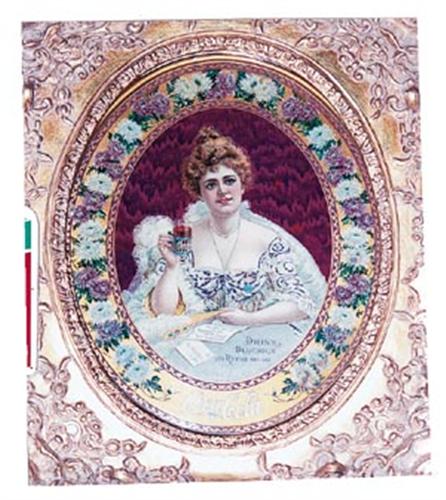 15"x19". This scarce sign is nicely displayed in a Victorian style frame under glass. Overalll presentation is very nice. Does have a few mildew spots, bottom central areas. Some short scrapes and scratches with color disruption. Primarily in 3 areas under her elbow, near her right shoulder and in the background field as well as a few touched up areas in the background field. Otherwise, only minimal marks and wear, a few rust spots and stains on the outer 3" border with a very shallow dimple dent, extreme outer left edge at around 10:00. Nice overall appearance and color on this tough piece to find. Cond. 7.4-7.7. Shows much better.