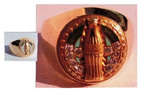 Beautiful man's Signet ring in 14K gold approx. size 8.5-9. features 10 diamond chips, a wonderfully detailed bottle and 50 year service pin logo. Only light-med overall wear. A beautiful collectors item.