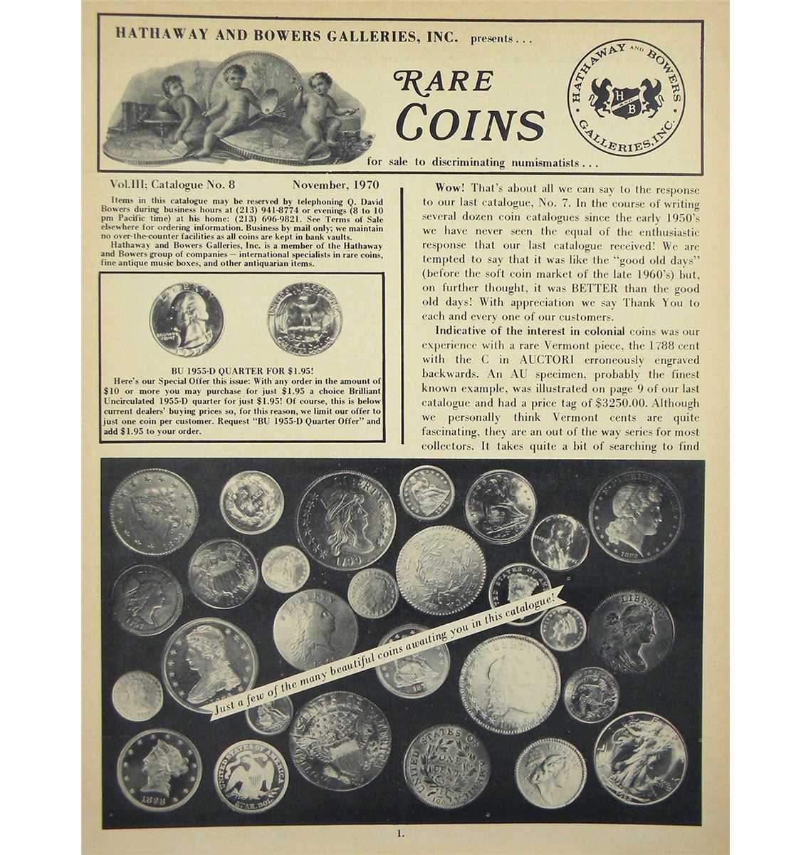 Hathaway and Bowers Galleries. RARE COINS FOR SALE TO DISCRIMINATING NUMISMATISTS... VOL. III, NO. 8. Santa Fe Springs, November 1970. 4to, self-covered. 48 pages; illustrated. Near fine. An early issue of what was renamed the Rare Coin Review with No. 10.