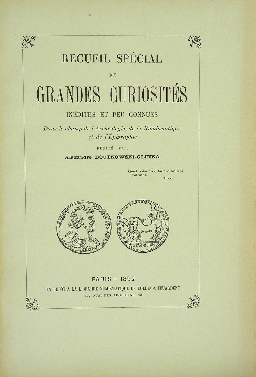 Boutkowski-Glinka, Alexandre. RECUEIL SPÉCIAL DE GRANDES CURIOSITÉS INÉDITES ET PEU CONNUES DANS LE CHAMP DE L’ARCHÉOLOGIE, DE LA NUMISMATIQUE ET DE L’ÉPIGRAPHIE. Paris, 1892. 8vo, original printed wraps. 58, (2) pages; text illustrations. Unopened; fine. A collection of essays, mostly concentrating on ancient coins. Boutkowski (Butkowski, Butkovskii), 1826-1894, is perhaps best known today for his Petit Mionnet (1889). Rare: the RBW copy was the first we had handled in over twenty years.