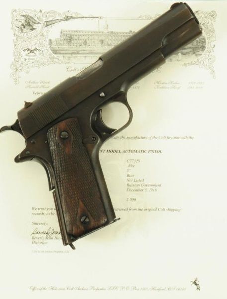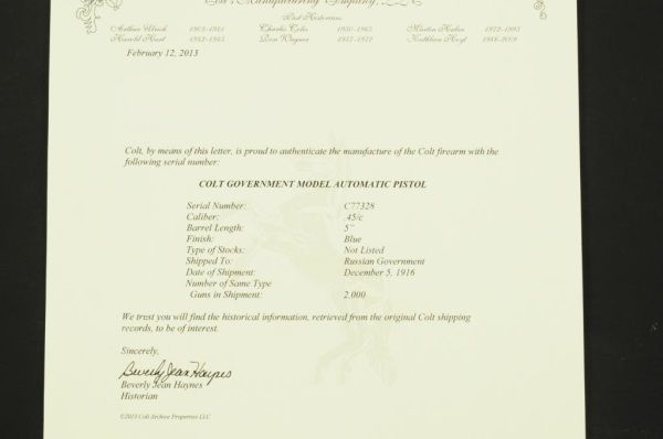 With Colt letter stating this is one in a shipment of 2,000 to the Russian Government in December 1916.