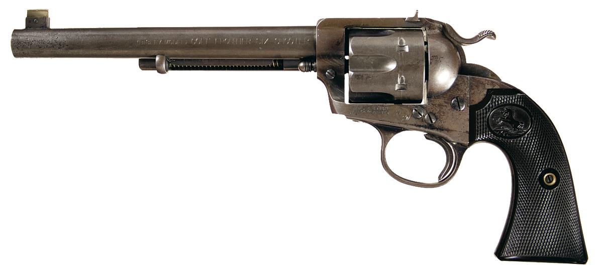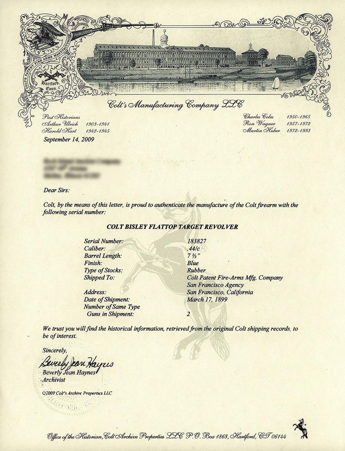 A very rare example of a .44-40 Colt Bisley Model Flattop Target Model Revolver manufactured in 1899. The table of Colt Single Action production records in THE BOOK OF COLT FIREARMS by R.L. Wilson indicates that only 97 Bisley Target Single Action Revolvers were chambered for the .44-40 Winchester cartridge. The revolver has a full blue finish with casehardened hammer and is fitted with two-piece, black hard rubber, checkered grips with the Rampant Colt trademark in an oval at the top. The revolver has a block front sight with nickel-silver blade on the barrel and a target rear sight on the flattop frame. The pistol has the distinctive Bisley hammer and elongated grip. The top of the barrel is roll-stamped with the one-line Hartford 'elongated block letter' address. The left side of the barrel is marked "(BISLEY MODEL) COLT FRONTIER SIX SHOOTER". The caliber designation "V 44" is stamped on the underside of the barrel just ahead of the frame. The left side of the frame is roll-stamped with the Colt 'two-date/two-line' patent markings followed by the encircled Rampant Colt trademark. The inside of the loading gate is stamped with the assembly number "599". The full serial number, "183827" is located on the bottom of the frame, the trigger guard and the backstrap. The rear face of the cylinder is stamped with the partial serial number "827". All of the serial numbers match. The accompanying factory letter verifies the serial number, caliber, barrel length, blue finish, rubber grips and that it was shipped as 1 of 2 to Colt Patent Fire-Arms Mfg. Company, San Francisco Agency, San Francisco, California on March 17, 1899.