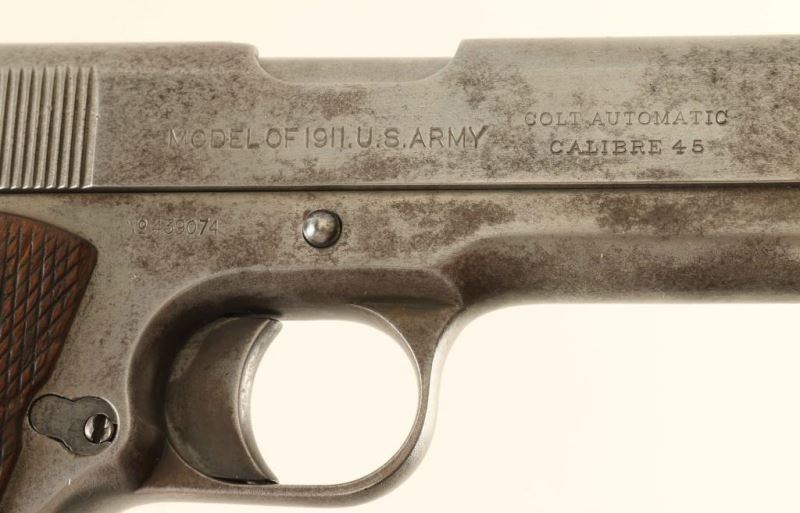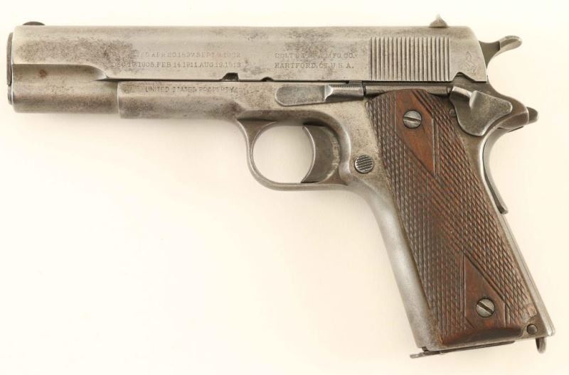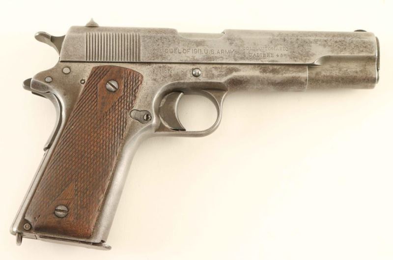 SN: 439074 1918 production U.S. military contract semi-automatic pistol with both commercial and military roll marks on the slide. This rare variation occurred when an effort was made to increase military production, machines and raw materials were transferred from commercial to military production at Colt with a limited number of slides transferred. Features a 5" barrel marked "COLT 45 AUTO," "P," & "G", low-profile round blade front sight, dovetailed 'v' notched rear sight, smooth long trigger, knurled wide hammer spur, manual safety on the left side of the frame, grip safety, push button magazine release, unmarked 7 round , "UNITED STATED PROPERTY" marked frame with [eagle's head]/"6" inspector stamp, smooth straight mainspring housing with lanyard loop and two piece double diamond checkered walnut grips. The slide is marked "PATENTED APR 20,1897.SEPT. 9,1902/ DEC19,1905. FEB.14,1911.AUG.19,1913," "COLT'S PT. F.A. MFG. CO./HARTFORD,CT. U.S.A." & [rampant colt] on the left side. "MODEL OF 1911. U.S. ARMY." & "COLT AUTOMATIC/CALIBRE 45" on the right side. The pistol is primarily in-the-white with brown patina forming. Action is smooth, the bore shows minor pitting throughout, markings are very good and the wood grips are good with wear. Condition is NRA Good. ***C&R Firearm***