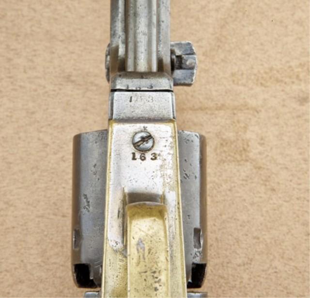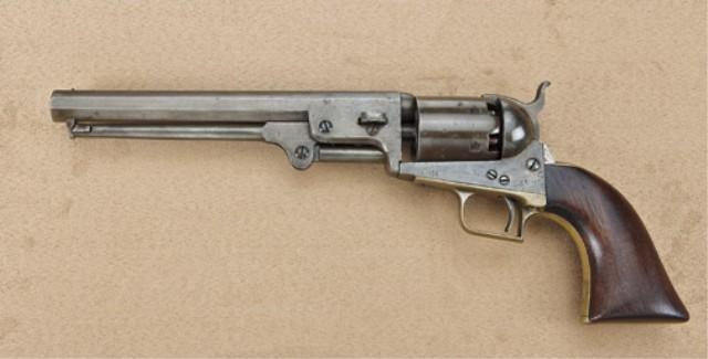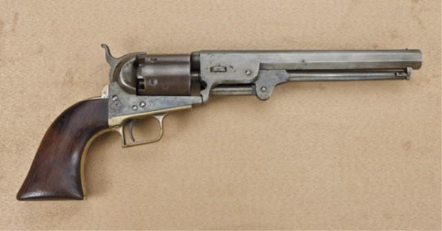 Rare Colt First Model square-back Navy, .36 caliber percussion, with wedge over screw, serial #163. The revolver shows some light cleaning and draw filing, particularly on the cylinder to remove rust and a light coating of brown applied. The metal surfaces are generally good with evidence of pitting having been removed, and still some significant pitting on some areas of the cylinder, top of barrel, and rear frame. The rear of the barrel has been relieved or set back slightly to fit better on the pins. The markings are good and visible. Loading lever shows only number “1”, and there is no number visible on the cylinder (probably removed when cleaned). The grips are good, showing wear at the edges and light cleaning but no sanding, and fit impeccably. The action is good, the interior is good. An absolutely original first-model that has had some legitimate cleaning and small restoration. One of the rarest Colt percussions, one of only 700 to 1,000 estimated to have been produced. Est: $4,000 - $8,000