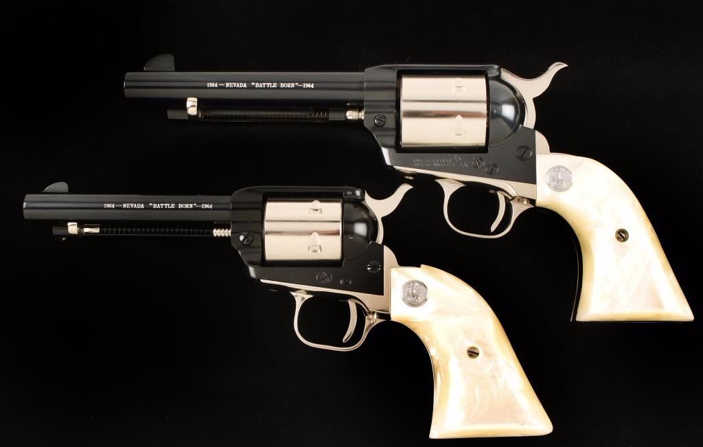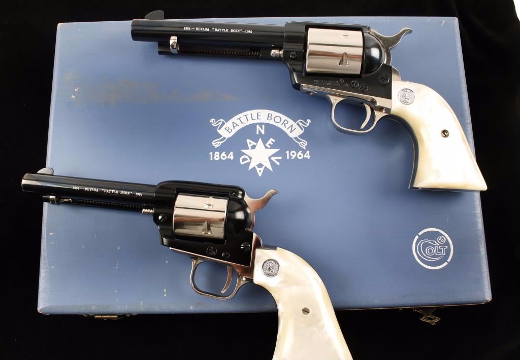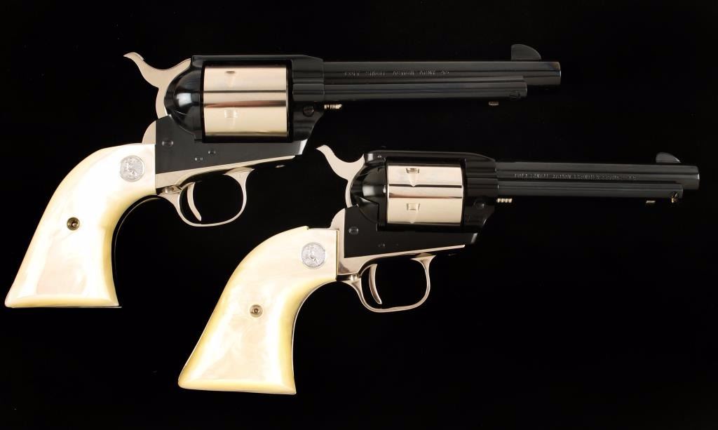Two gun set comprised of a Single Action Army and a Frontier Scout chambered in .45 Colt/ .22 Long Rifle, SNs: 0056NB/056BB. Among the rarest of all Colts with only 20 sets estimated to have been produced, circa 1964. Revolvers feature black finishes with polished steel accents, 5.5"/4 3/4" barrels, blade front sights, notched rear sights, non-fluted six shot cylinders, ejector rods, checkered hammer spurs and Colt medallion faux mother of pear grips. Includes their original presentation display case with brass furniture and blue cloth lined interior. Revolvers show no evidence of firing or use. Display case shows some storage type mars and minor scratches. A very fine and desirable set. Condition is excellent. ***C&R Firearms*** ***Modern Firearms***