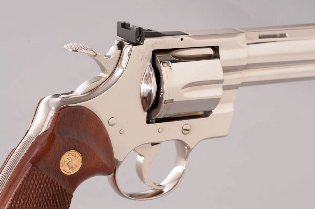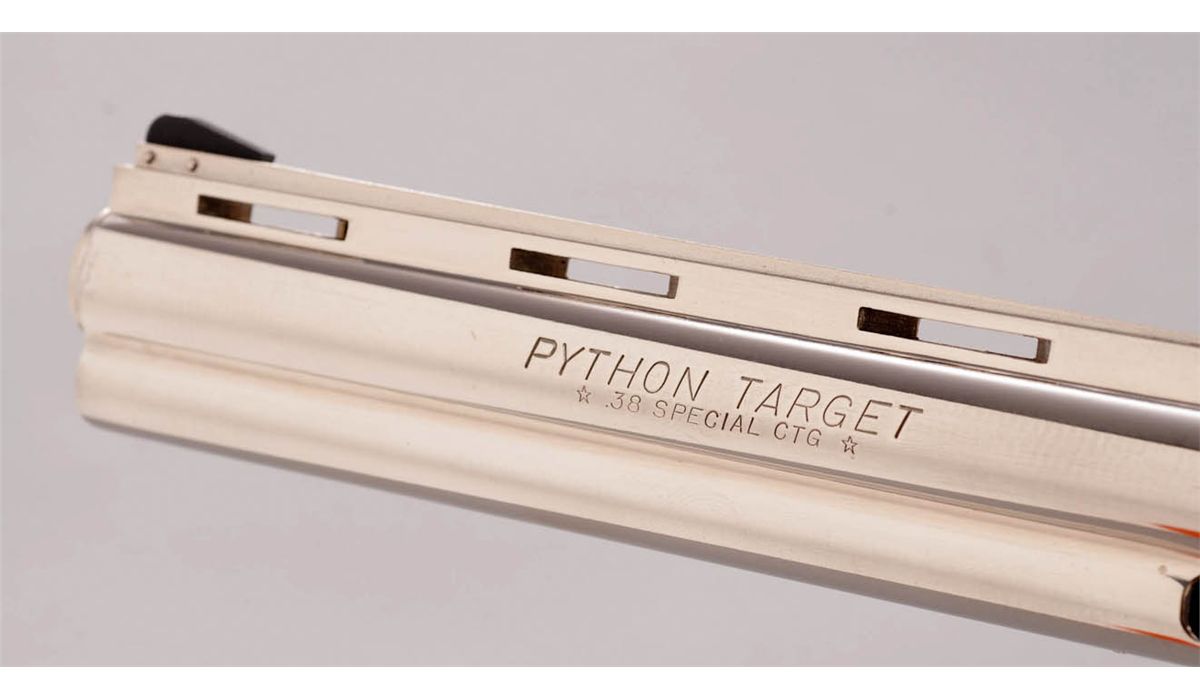 Rare Colt Python Target Double Action Revolver, #K04357, .38 Spec. cal., 8'' barrel, bright nickel finish, factory checkered walnut grips with gold Colt medallions, satin nickel sighting plane, with standard black adjustable rear sight and ramp front sight. This model is considered quite scarce with only 251 examples built in nickel. Mfg'd 1980. Condition is excellent with only very minor scuffs to topstrap, right side of frame and just below rear sight. Near imperceptible index mark to cylinder. Factory tight action with mirror bright bore. Est.: $2,500-$4,000. (Modern)