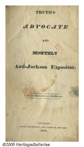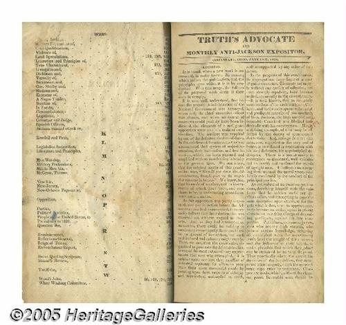 <B>Rare Complete Bound Set of Ten 1828 Anti-Andrew Jackson Campaign Pamphlets</B></I> <I>Truth's Advocate and the Monthly Anti-Jackson Expositor</B></I> began publication in Cincinnati in February 1828 and continued through October. The tracts contained a steady barrage of vicious anti-Jackson propaganda. In addition to legitimate political criticism, these tracts attacked Jackson's personal life, accusing him of seduction and adultery, illiteracy, military brutality, hypocrisy, corrupt land speculation, buying and selling slaves, and more! This set appears to have been issued as a single volume, probably just before the November election, as it includes at the front an index, by subject matter, covering all ten issues. Published "by an association of individuals" and printed in Cincinnati by "Lodge, L'Hommedieu, and Hammond, Printers. 1828." 400 pages. Nice modern cloth binding. Ex-library copy from the legendary Mercantile Library, one of the great repositories of early historic American printed matter. Some light to moderate water staining affects earlier pages, otherwise the contents are crisp and in excellent condition. 5.25" x 9.5". Lot:256