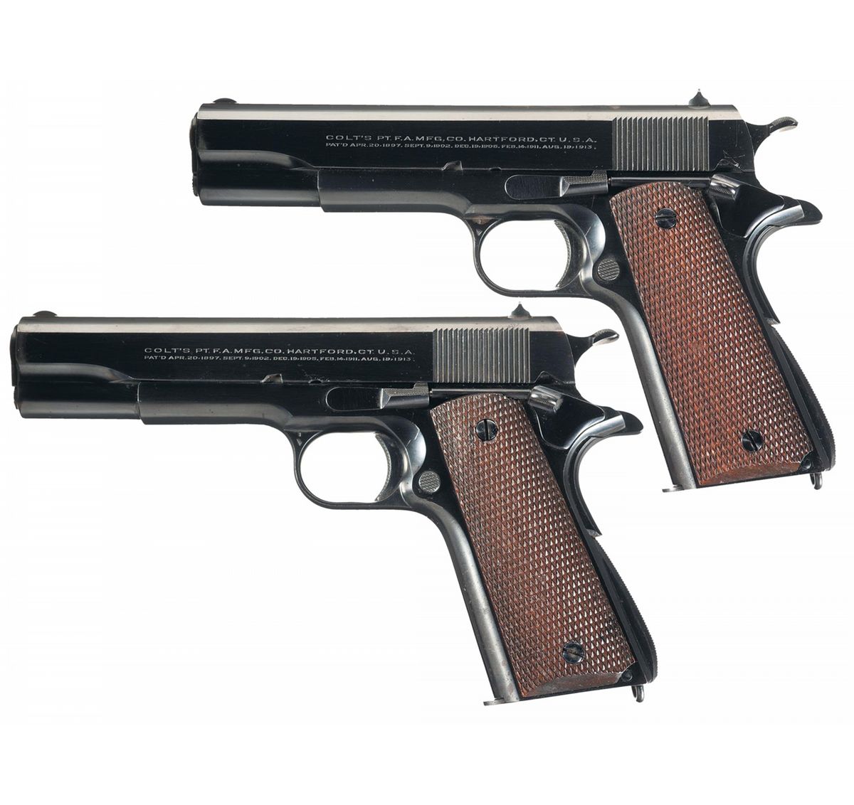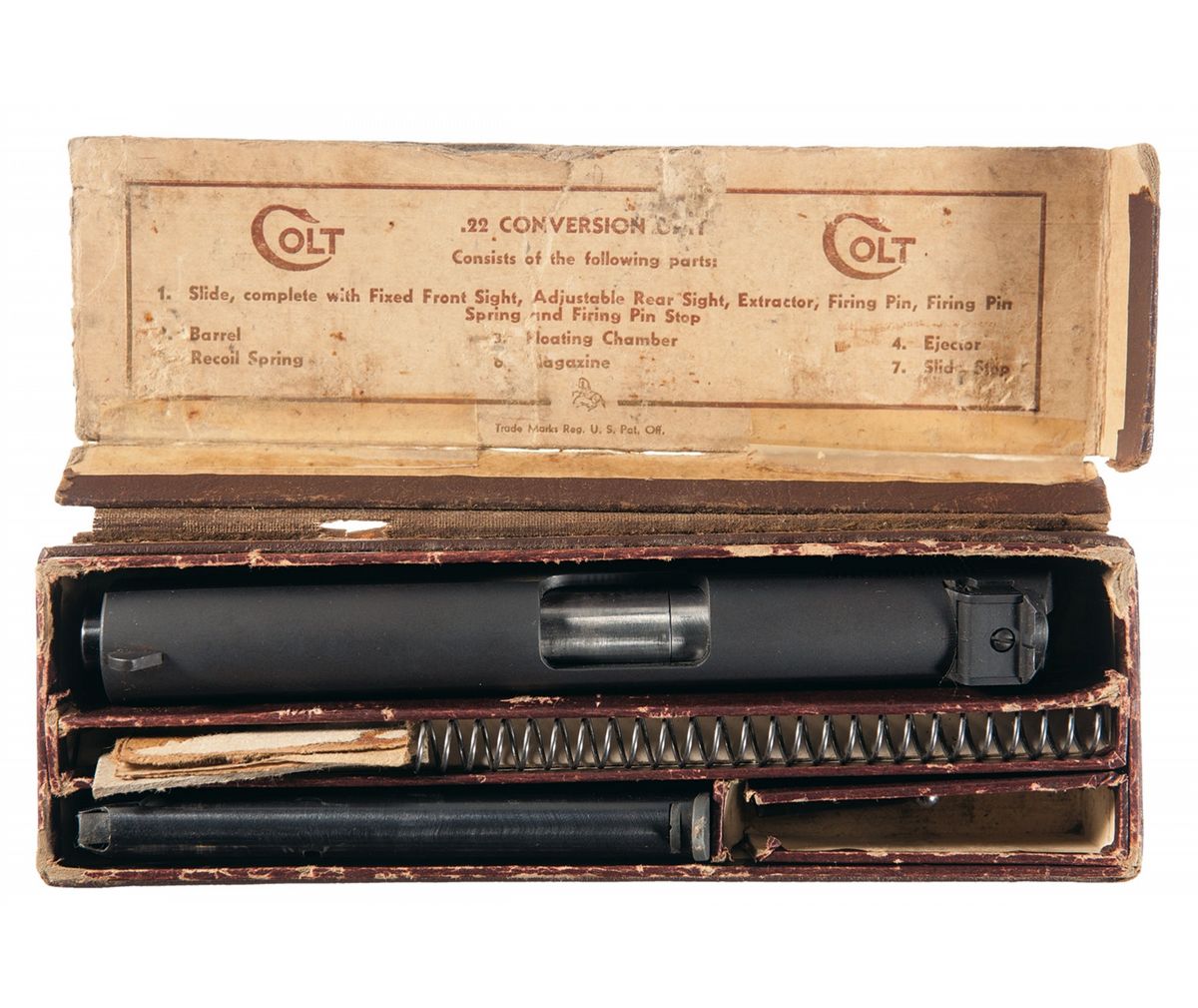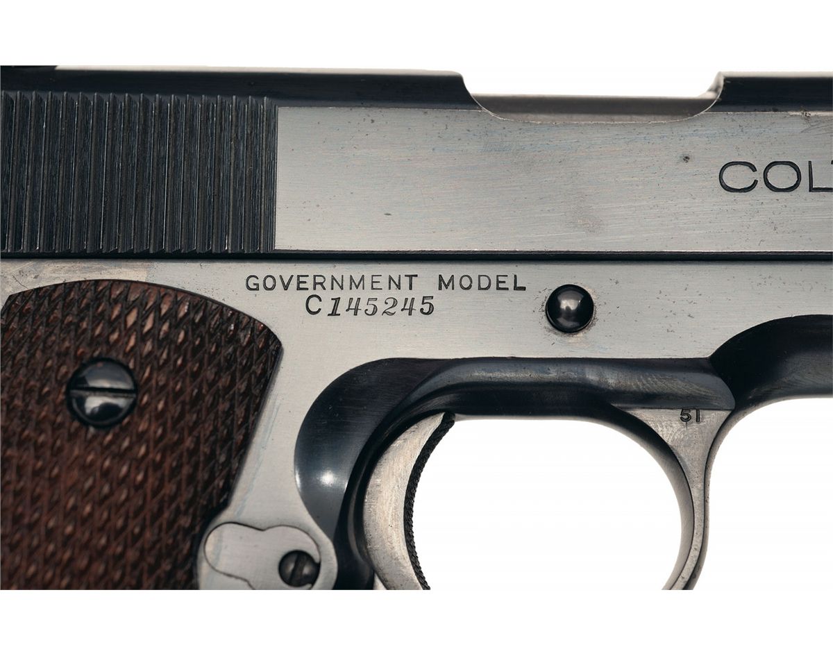 A) Manufactured in 1926. Slide has the two line Hartford address/patent dates marking on the left side and the caliber marking with the Rampant Colt on the right side. The right side of the frame has the model/serial number marking. The trigger guard is marked "51" and "1/factory triangle proof". Has an unmarked two-tone magazine. Comes with a boxed Colt .22 caliber conversion kit. How many consecutively serialized Colt Government Models have you seen? Is consecutively serialized to Lot 752.