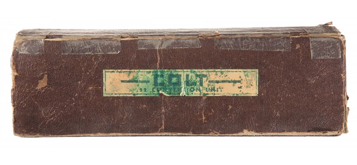 Condition: Very fine as partially refinished (cold blue on top right slide and muzzle). The pistol retains 95% original blue finish with some edge wear near the muzzle, some pitting forward of the ejection port on the right side and light spotting on the grip straps. The grips are excellent with a few minor blemishes in the overall crisp checkering. Mechanically excellent. The conversion kit is excellent showing some light edge wear and some mild handling marks. The box is poor.
