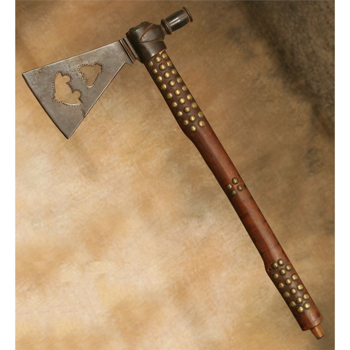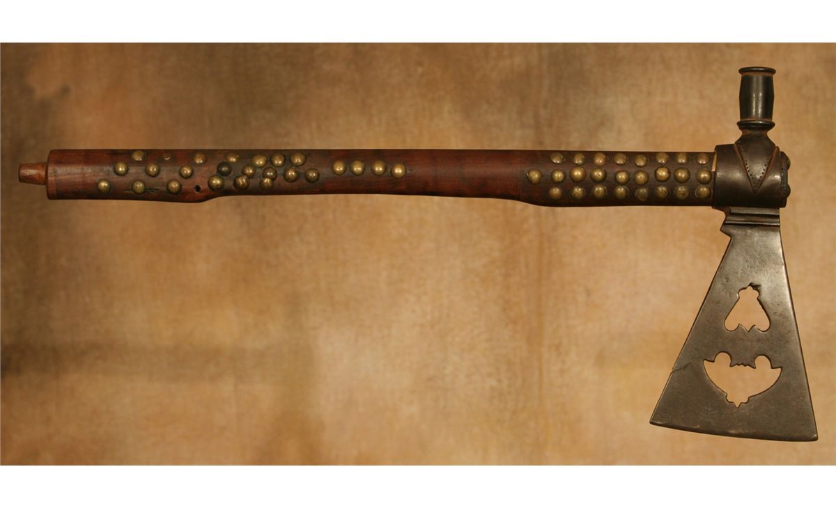 Rare Crow Pipe Tomahawk. Double batwing cutouts. 20" haft exhibits light hot file branding, elaborate brass tack designs & a relief-carved smoking tip. The forged iron head features an extended eye collar, forged chevrons, file work & punch dot designs. The 6" blade has two cutouts, referred to by collectors as batwing cutouts. Collected from the Crow. Circa 1880. Fewer than twenty-five authentic examples are known to exist in museums and/or private collections. Ex Dr. Ted & Lilly Jarvis collection