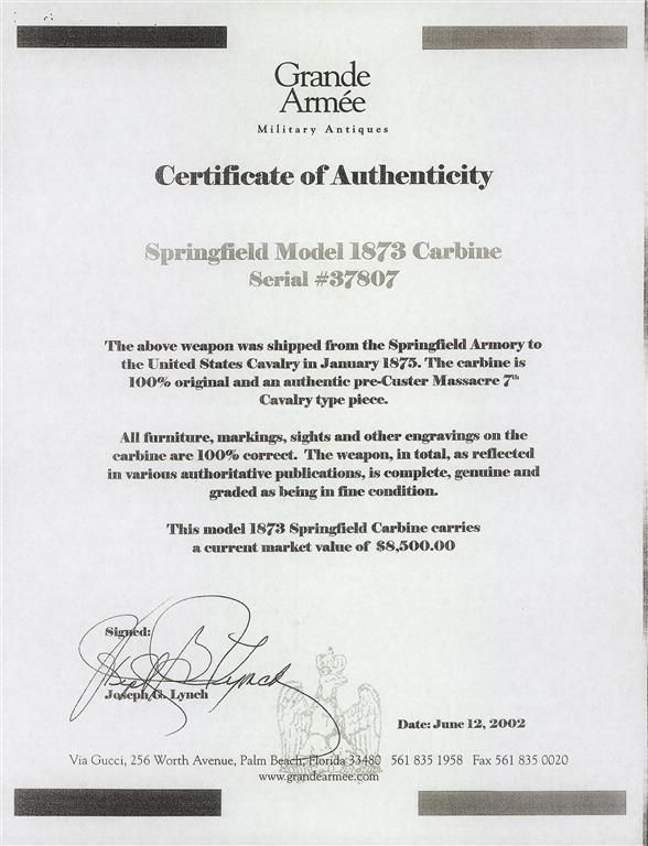 This is a wonderful example of a rarely encountered U.S. Springfield Model 1873 Carbine manufactured circa late 1873 which falls right in the middle of the noted Custer era serial number range carbines; (33,000-43,700). Custer era carbines found in this range were issued to 7th U.S. Cavalry Companies C, D, I and K. This desirable carbine is accompanied by copy of a certificate of authenticity from Grande Armee Military Collectables (Palm Beach Fla). This is a very fine example of an original unaltered Custer era carbine that has all the original 1873 era carbine features. The lock is marked with the standard American Eagle crest followed by "U.S./SPRINGFIELD/1873" ahead of the hammer, the high arch breech block is marked "MODEL/1873/eagle head/crossed arrows/US" and the serial number stamped on the top rear of the receiver. It has the original flush fitting receiver and barrel, which has the original 1873 pattern carbine rear sight with the ladder graduated from 6-12 (600-1200 yards) on top with 1-5 (100 to 500 yards) on the right side of the base with the original integral front sight still in place. It has the original Second Pattern one-piece barrel band with the split sling swivel with the patent date on the front side. The stock is the correct long comb/short wrist carbine stock that has its original smooth buttplate with no trapdoor or storage compartment, with the U.S. stamped on top of the heel. The top rear section of the comb is stamped with a rack number of "2 G/24. The stock has a faint circled "ESA" cartouche on the left side with a circled script "P" proof on the underside in the pistol grip area. It still retains its correct sling bar and ring on the left side.