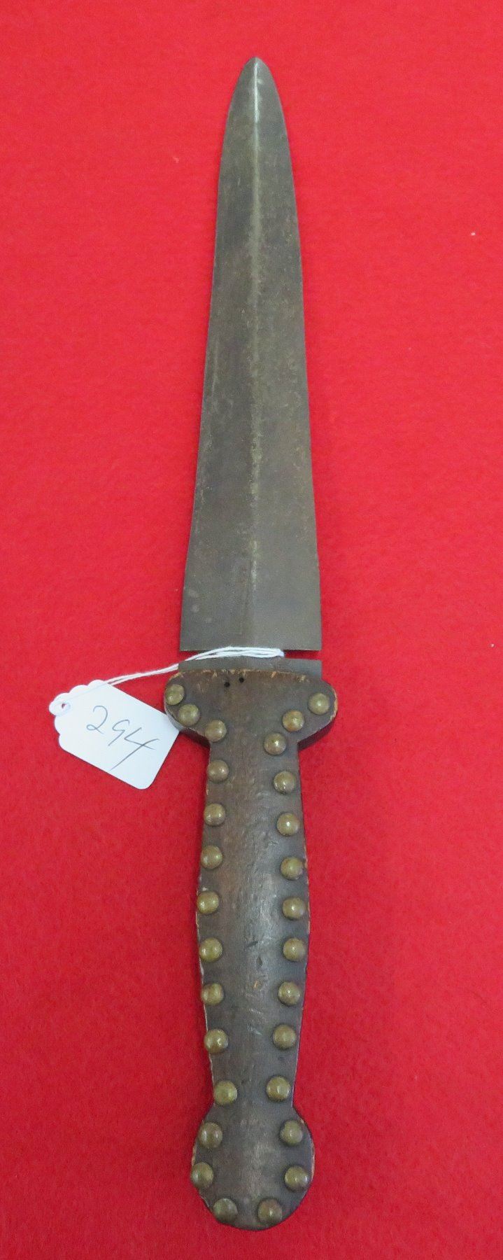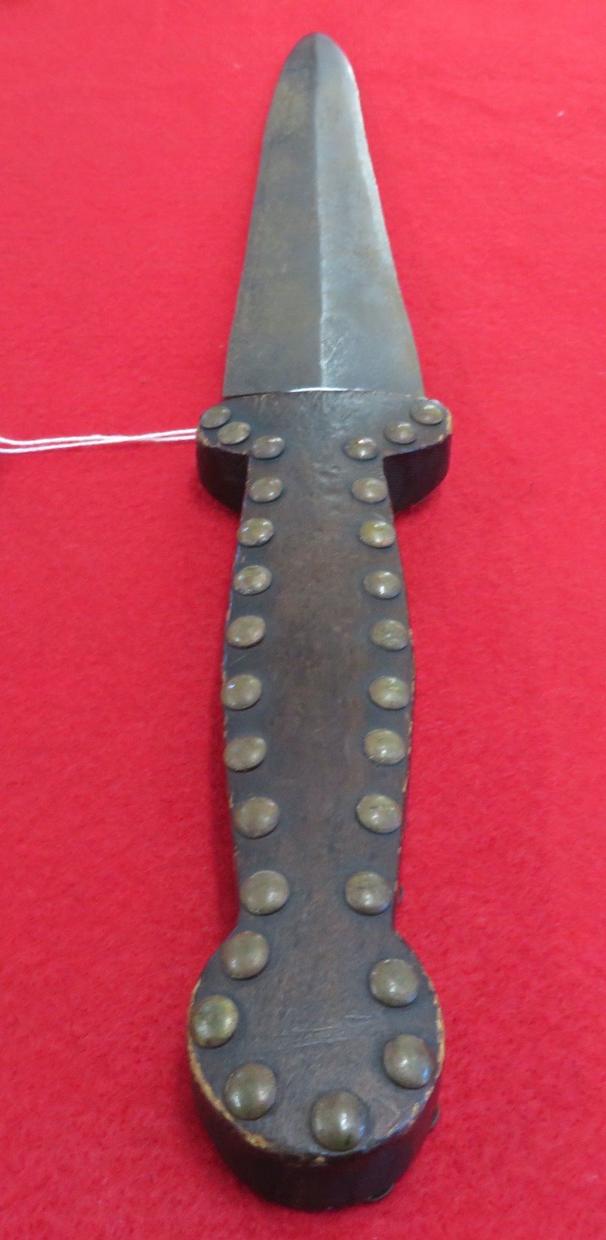 Rare Dag Trade Knife, c. 1800s. Made of wood, brass and steel, the item measures 17" x 2 1/2". New York, Ewin Hill & Co. Condition: Wear, rust and patina, see images. Shipping: $45.00 w/insurance and signature, due to value.