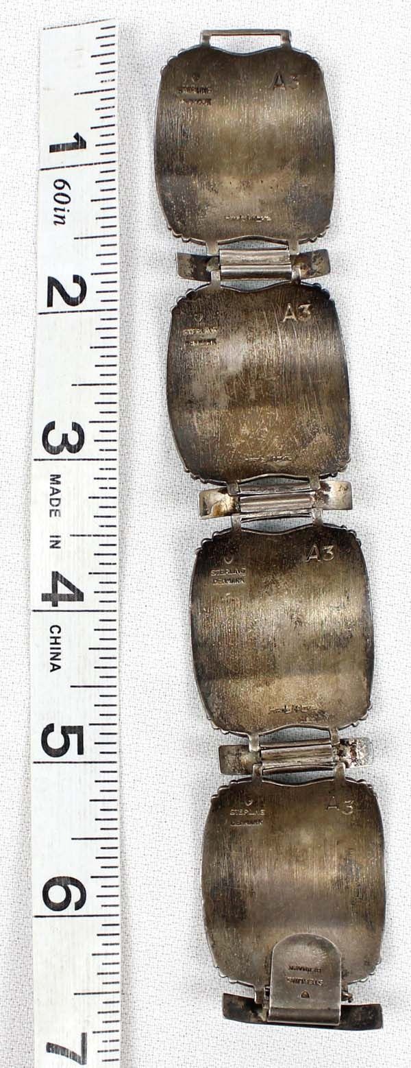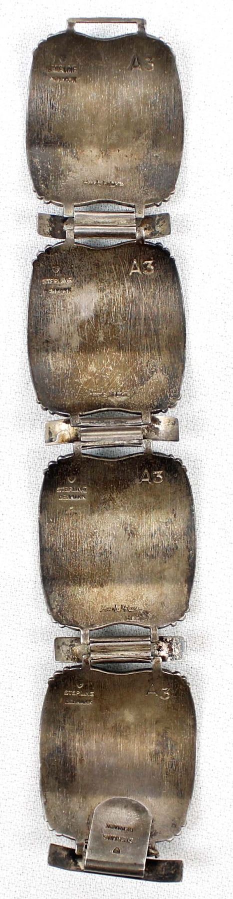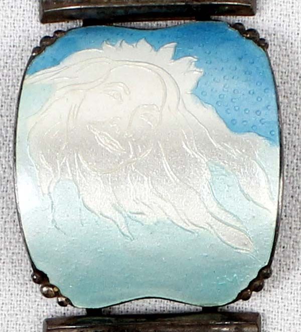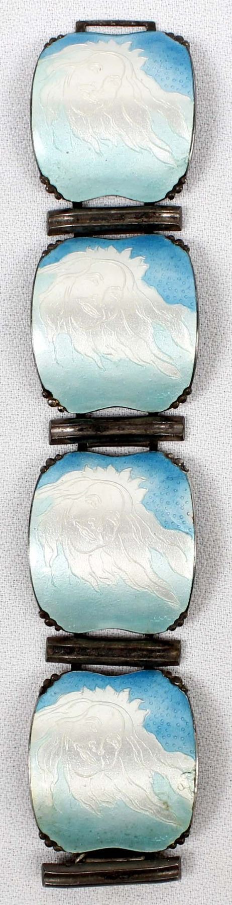 Ultra-rare Sterling Silver & Vitreous Enamel Bracelet by Danish Artist, Author & Explorer Harald Moltke, circa late 1940's early 1950's. Signed Harold Moltke, Sterling Denmark, A3 & with KG - internet research shows this to stand for Kebenhavns Guldsmedie, Copenhagen 1944 - 1955. This bracelet depicts The Snow Queen with flowing golden white hair on a cobalt background. Influenced by an original fairy tale written by Danish author Hans Christian Andersen. Four convex plaques joined by molded bar links. Measures 1 ¬'' x 6 5/8'' laid flat. Interior diameter when clasp is engaged 2 ¬'' x 2''; interior diameter 2 11/16''. Weighs 61.52 grams. Unusual clasp - tongue threads through & folds flat. Harald Moltke born 1871, best known for his paintings, also an author & explorer he was a draughtsman on four Arctic expeditions from which his work was inspired.