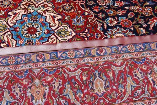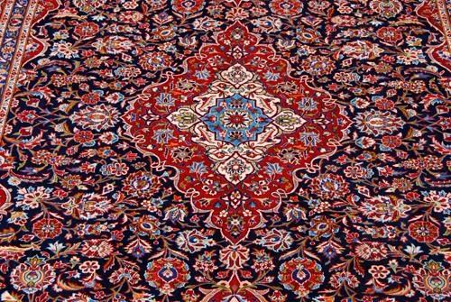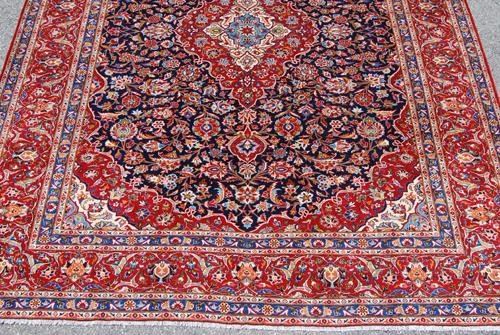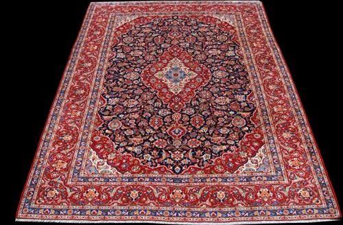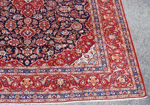 Rare dark toned very beautiful Persian Kashan. Size 12.7 X 10 feet, made of fine quality lamb's wool pile on cotton foundation, all natural vegetable dye, incorporating a beautiful free flowing Shah Abbasi floral pattern on a navy blue background; large centerpiece medallion, finely done crowned corners, and framed beautifully with an intricately done floral border.  Please notice and appreciate the warm and dark tone utilized in creating this beautiful rug.  Hand woven in Kashan, Iran.