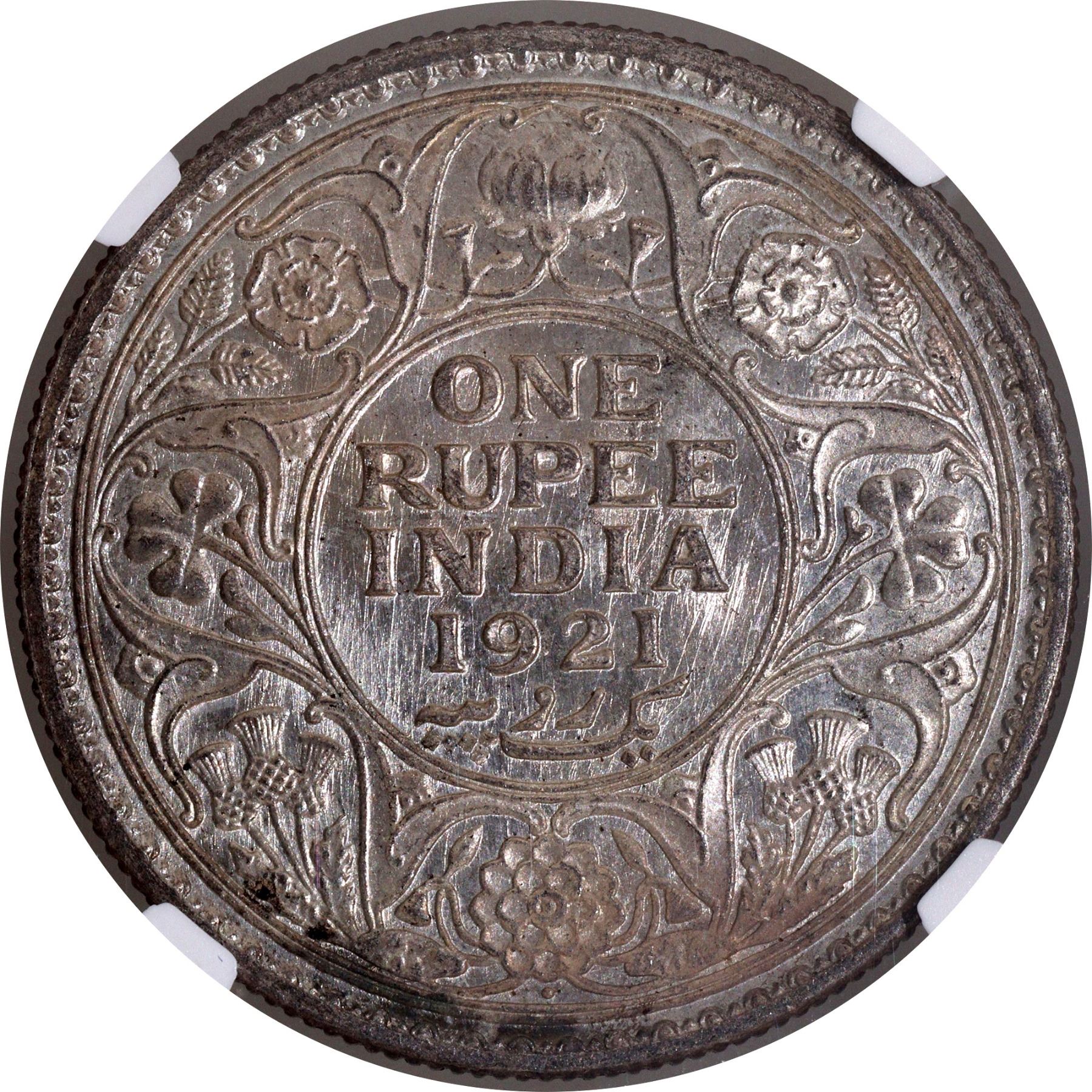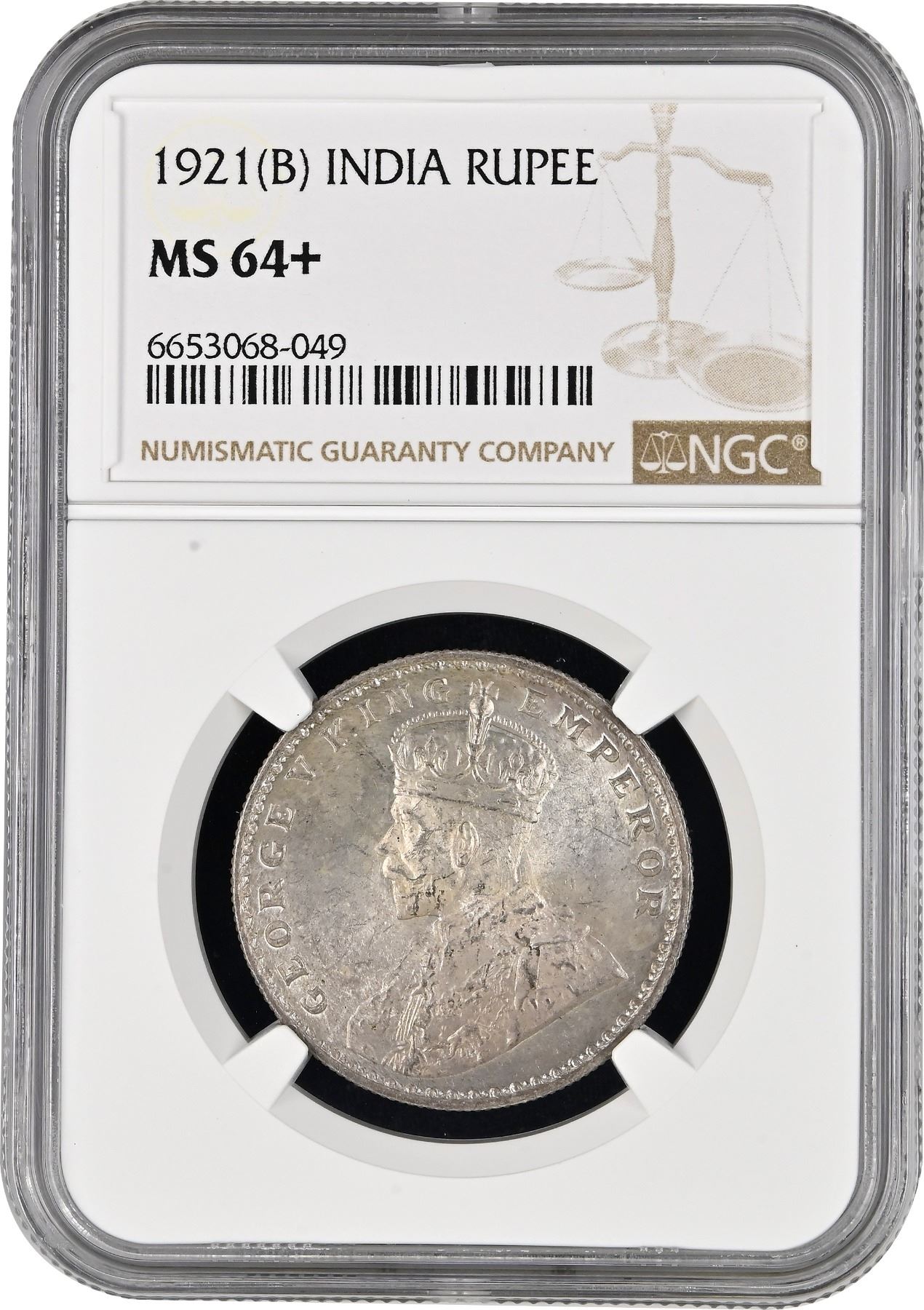 1921, King George V, Silver Rupee, Bombay Mint, dot, (PR # 227/GK # 1043), iridescent toning on both sides, superb quality, strong features, graded & slabbed by NGC as MS 64+, Rare date, Very Rare in this grade.