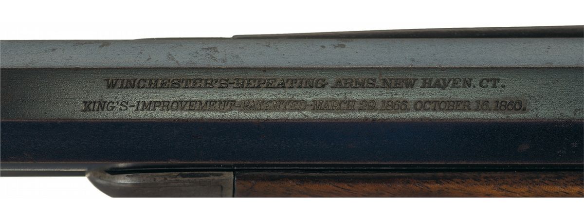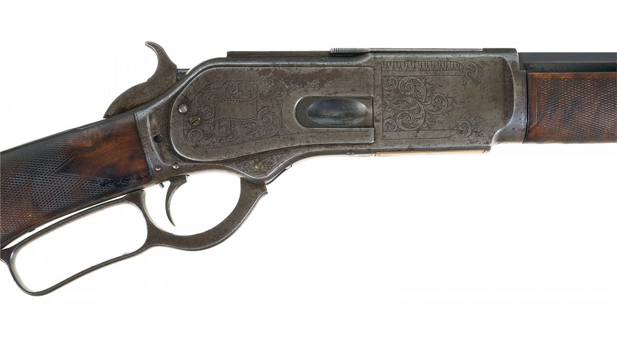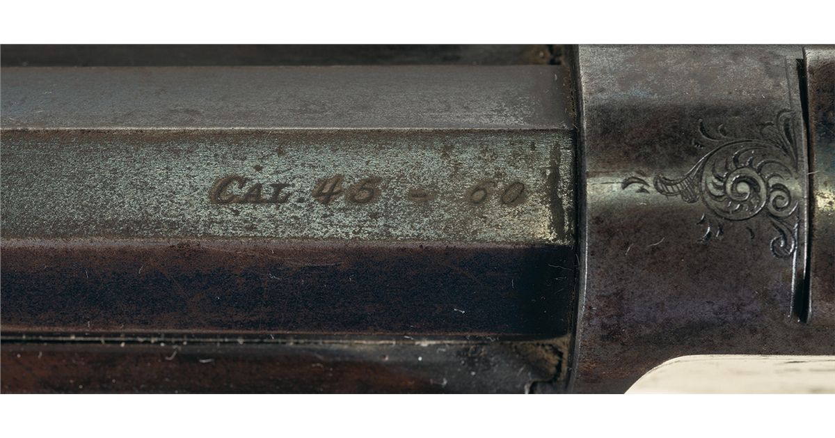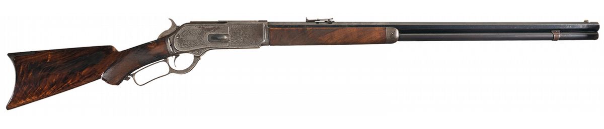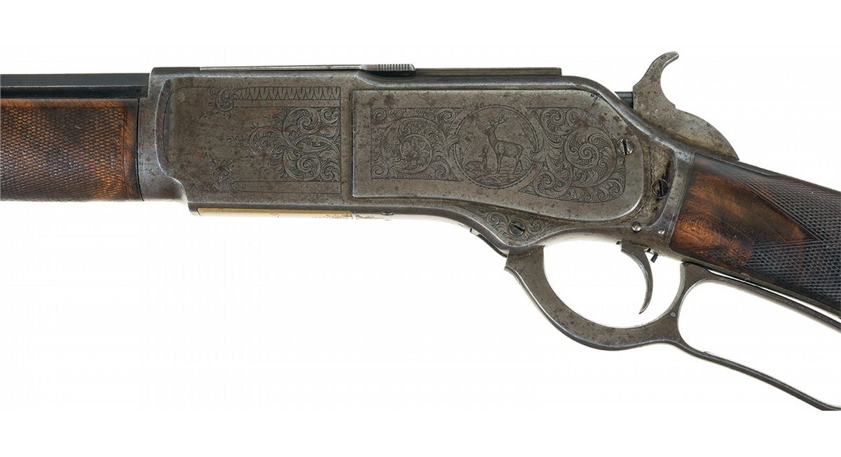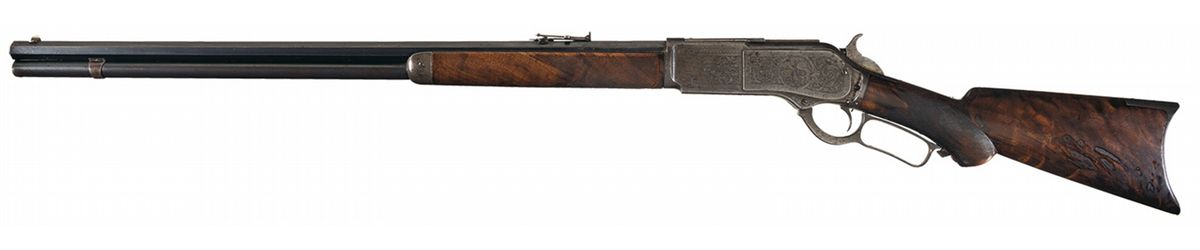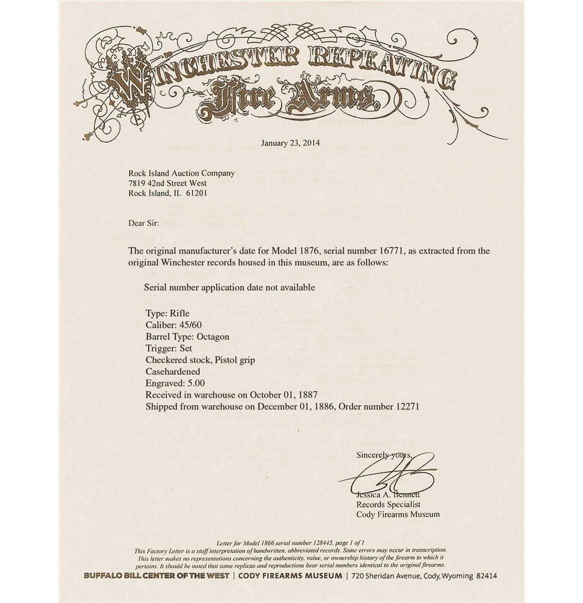 This is a fine original example of a documented factory engraved Winchester Model 1876 Lever Action rifle that was manufactured in 1881. The rifle has the Second Model receiver with screw-fastened dust cover guide rail and later style dust cover with serrated finger guide. The 28 inch full octagon barrel, full length magazine, dust cover and loading gate are blued and the forearm cap, receiver, hammer, lever and crescent buttplate are color casehardened. The forearm and pistol grip stock are highly figured, fancy grain, walnut with checkered panels and a piano finish. The forearm cap, dust cover, cartridge elevator, receiver and buttplate heel are factory engraved with fine scrollwork on a punch dot background. The left side plate is engraved with a game scene featuring two detailed deer and the right side plate has an open banner. The engraving is nearly identical to the Ulrich engraved Model 1873 carbine illustrated on page 186 of "THE BOOK OF WINCHESTER ENGRAVING" by R.L. Wilson. The rifle is equipped with a special order single-set trigger. The barrel has a sporting style front sight with nickel-silver blade and a folding leaf rear sight graduated to 1000 yards and marked "1876" at the top of the leaf. The upper tang is factory drilled and tapped for a receiver sight. The pistol grip has an ebony inlay. The crescent buttplate has a sliding brass trap door. The top of the barrel is roll-stamped with the two-line legend "WINCHESTER'S-REPEATING ARMS. NEW HAVEN. CT./KING'S-IMPROVEMENT-PATENTED-MARCH 29. 1866. OCTOBER 16. 1860." ahead of the rear sight. The caliber designation "CAL. 45-60" is located on the top barrel flat between the rear sight and the receiver. "45-60" is stamped in script numerals on the cartridge elevator. "MODEL. 1876." is roll-stamped on the upper tang. The serial number "16771" is stamped in small numerals across the lower tang between the lever latch and the tang screw. Included with the rifle is a factory letter, which verifies the caliber, octagonal barrel, set trigger, checkered pistol grip stock, casehardened receiver and the Five Dollar level engraving. Additionally, the letter reports that the rifle arrived at the warehouse on October 1, 1887 and left on December 1, 1886, which we ascribe to a transcription error.