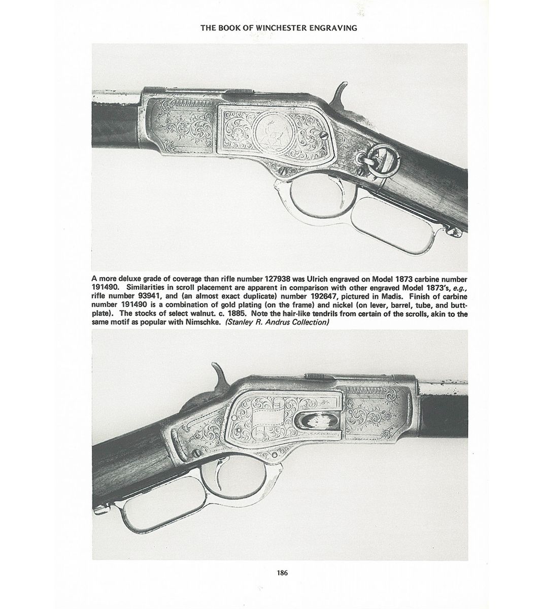Fine. The rifle is all original with about 70% plus of the original blue and casehardened finish. The balance of the blue finish on the barrel and magazine has aged to an attractive plum-colored patina. The metal surfaces are smooth, the barrel edges are sharp and the markings are crisp. Substantial amounts of nitre blue finish remain on the loading gate and dust cover. The case color pattern is visible on the forearm cap, receiver, hammer, lever and buttplate have mostly faded to a mottled, silver-gray, patina. There are several small spots of light pitting on the bottom and sides of receiver and a small spot of surface corrosion on the right side plate. The flawlessly executed, Ulrich-engraved scrollwork and game scene are crisp. The highly figured, deluxe walnut stock and forearm are both in fine overall condition with moderate wear. The checkering on the stock and forearm shows moderate handling wear and there is some finish loss on both sides of the stock. This is a fine example of a rare, deluxe, Ulrich Factory Engraved Special Order Winchester Model 1876 Deluxe Lever Action rifle.