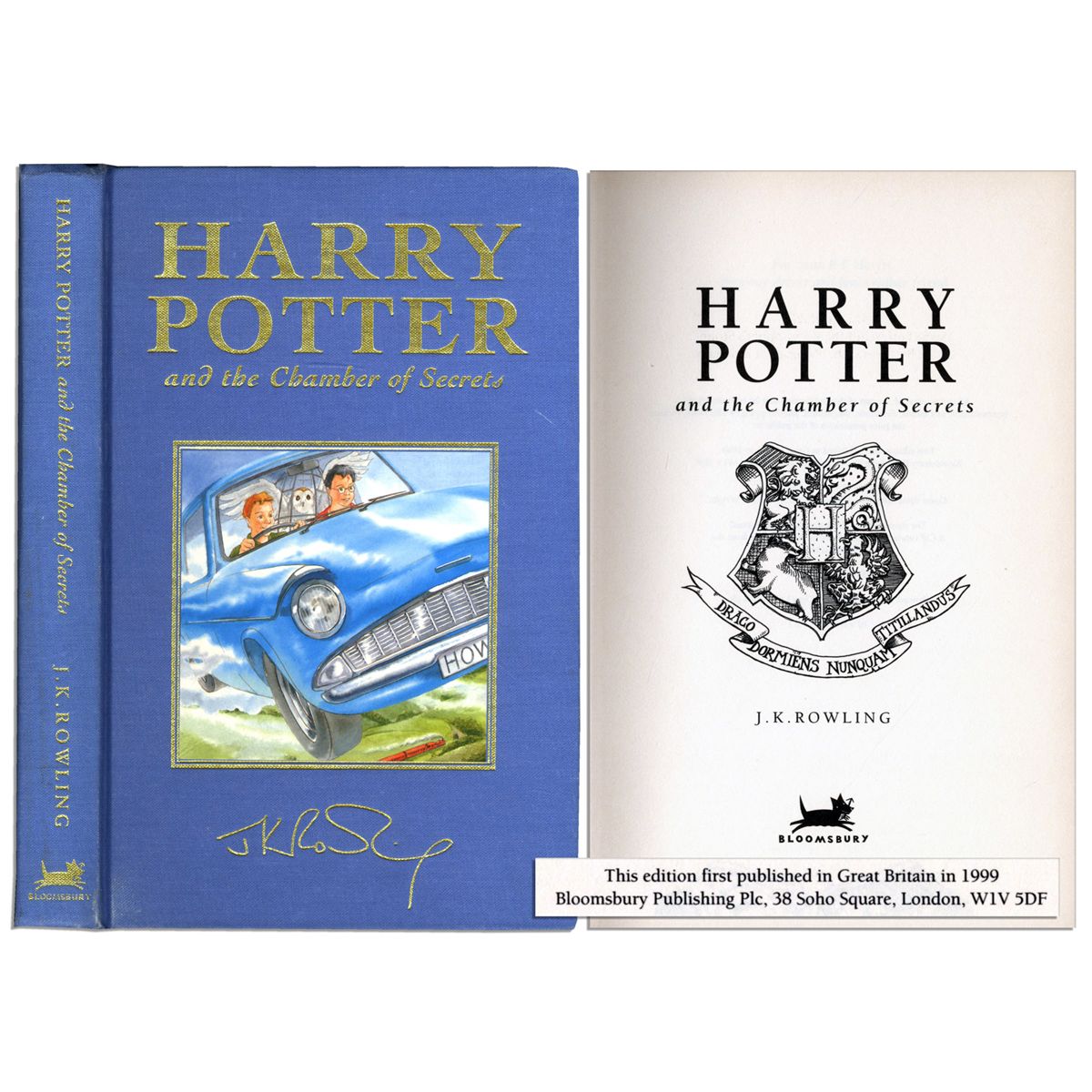Prized deluxe U.K. first edition of ''Harry Potter and the Chamber of Secrets'', Bloomsbury Publishing: London: 1999. The second novel in J.K. Rowling's series continues the story of boy wizard Harry Potter and his friends. Runs 251pp. and measures 6.25'' x 9.5''. Bound in pictorial blue cloth boards with gilt lettering. All edges gilt. Light bumping to board and spine corners, else fine. A beautifully bound tome from the best selling book series of all time.
