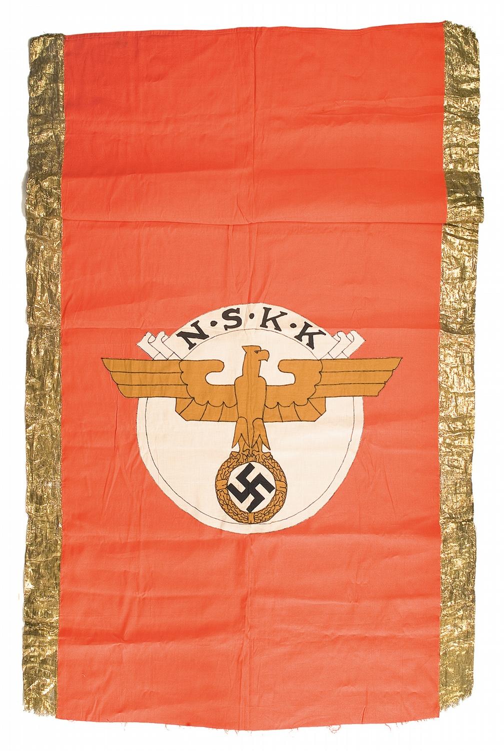 The NSKK started as a motorized element of the Sturmabteilung, becoming an independent organization in 1934 and eventually taking control of military and civilian drivers education for the Third Reich. Measuring 82" long and 46 1/2" wide, this single sided banner has 3 1/2" gold mesh borders running down the sides, cloth field, eagle, lettering and swastika, and stitched black thread detail. See included image. This item is pictured on pg. 205 of "NSKK, NSFK Uniforms, Organization & History" by J. Angolia & D. Littlejohn (1994).