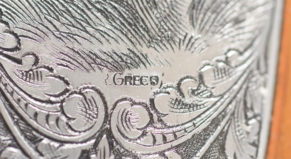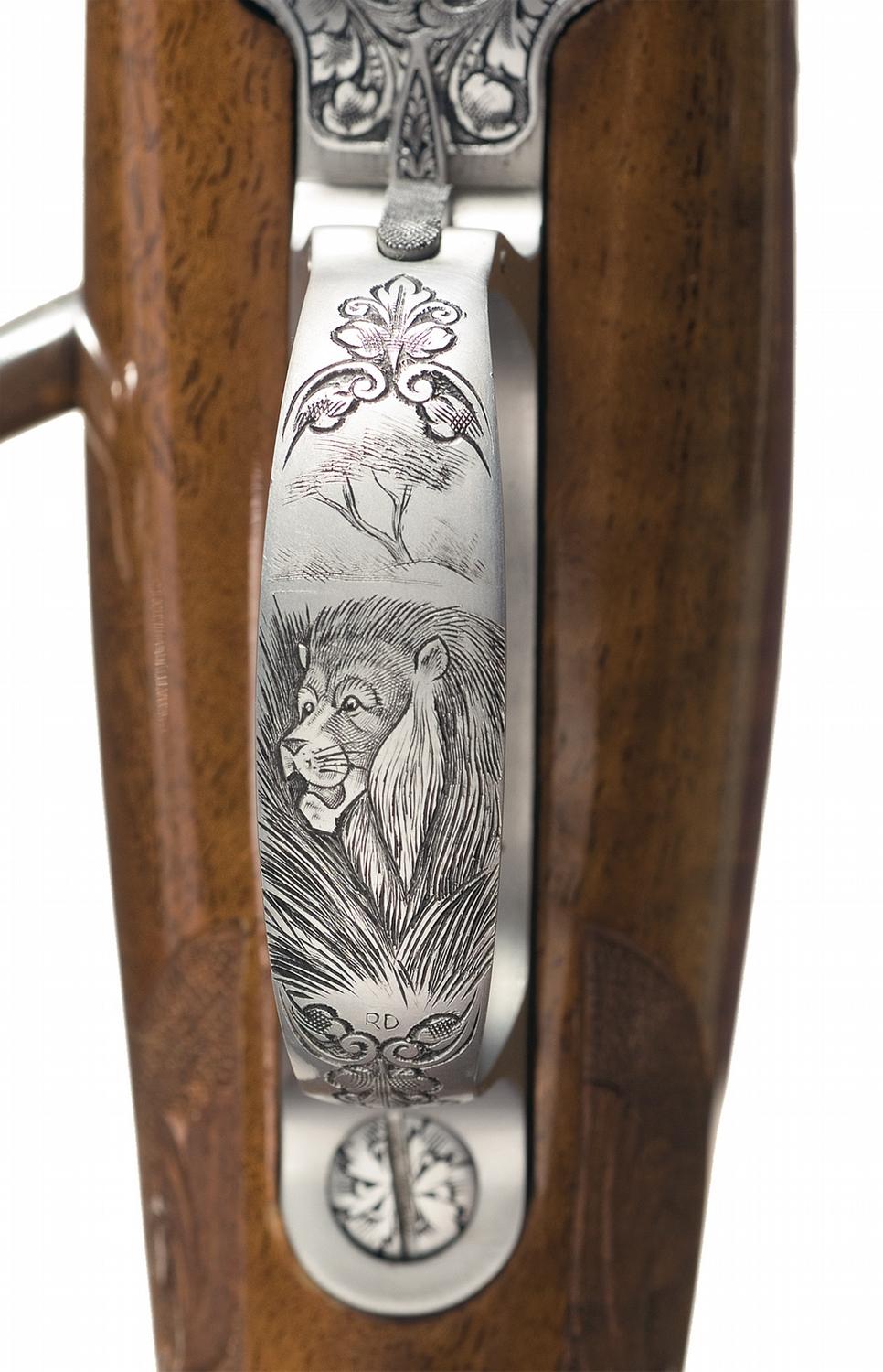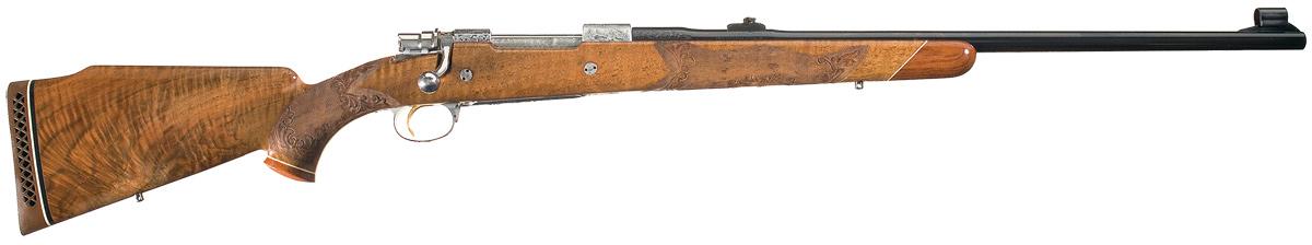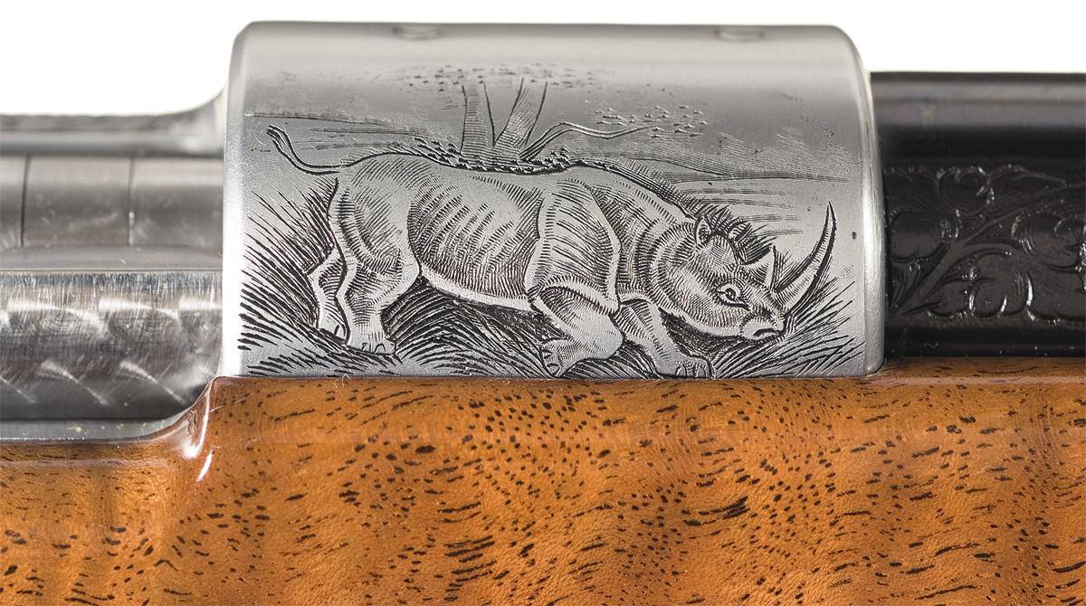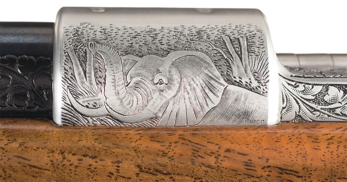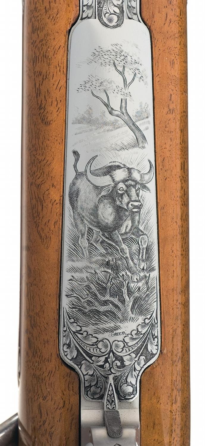 Manufactured in Belgium in 1977, this rifle features a hooded ramp front sight and adjustable rear folding sight. The barrel is blue and the remaining parts are satin French grey with a gold washed trigger. The bolt and follower are polished and the desirable long extractor is jeweled. The front receiver ring is engraved with a rhinoceros in tall grass on the right side, an elephant in a wooded jungle scene on the left and the remainder of the action is scroll leaf and punch dot engraved. The hinged floor plate is engraved with a cape buffalo in a plains scene with floral scroll engraving below and on the attaching metal. The trigger guard is engraved with a lion's head amid tall grass, with "RD" at the bottom. The floor plate and left front of the receiver are signed "R GRECO". There is a 2" wedge of floral leaf engraving. The stock is extra fancy select walnut with a high gloss finish, fine line checkering and floral and punch dot hand carving on the forearm and grip area, contrasting forend and grip cap with a diamond shaped brass inset on the grip cap, raised comb, cheek piece, rubber vented Browning recoil pad and sling swivel studs.