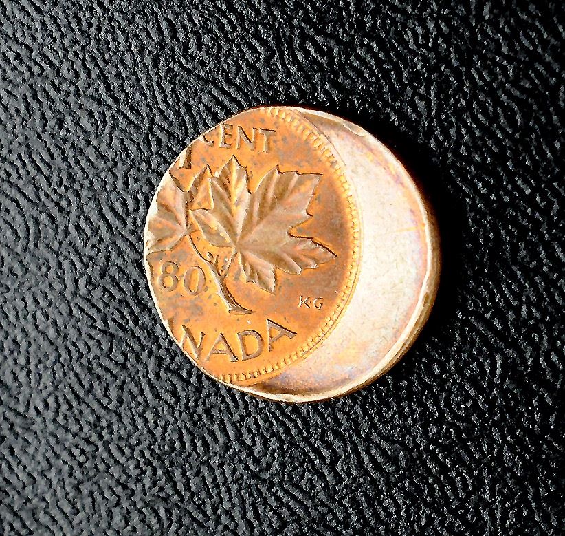 Small Cent, 1980, Error. Off center strike 40%. The error occurred when the planchet got stuck on the die, causing multiple strikings as the metal spread. Two distinct impressions of the obverse and reverse. Only the "80" of the date shows. 2.75 gr. Rare.