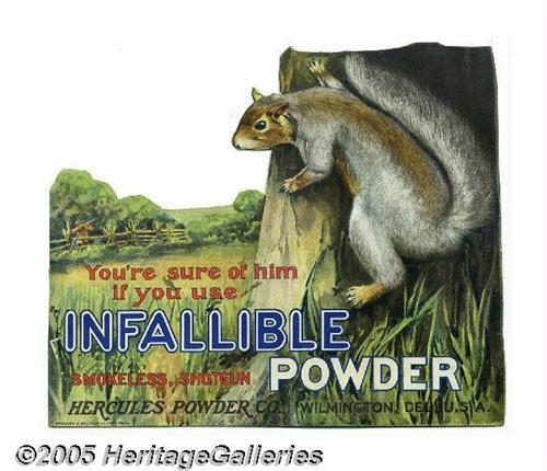 <B>Rare Diecut Hercules Powder Counter Sign</B></I> Stands 10 1/2" x 9", advertising that company's "Infallible Powder." Pictured in great detail is a scene of a distant hunter in knickers taking aim at a squirrel escaping to the safety of a tree. This 1920s era sign, with a perfect folding back stand, has a near mint appearance, only showing a few very light rub marks and minimal edge wear. Bright color graphics make this piece a real eyecatcher with a great display presence. Lot:252