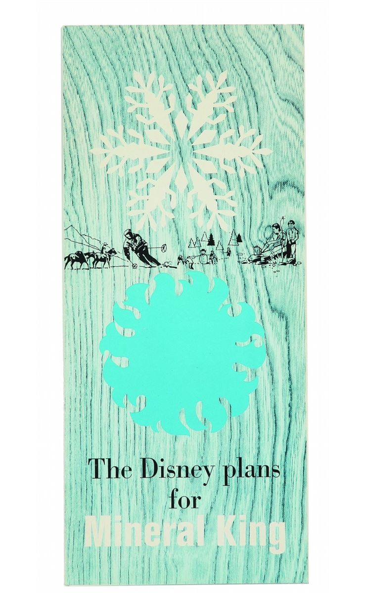 (Walt Disney, 1966) Rare four-fold brochure explaining Disney's plans for a ski resort to be built in the Mineral King Valley of the Sequoia National Park. The four-fold brochure features Disney's plans for the area as well as thoughts on expansion in the future. After being granted a permit to develop by the U.S. Forest Service in 1965, Disney met resistance on the development from the Sierra Club and other environmental groups. By the early 1970s, the plan was abandoned. Measuring 4" x 9.25" folded, the brochure is in good condition with minor wear throughout.