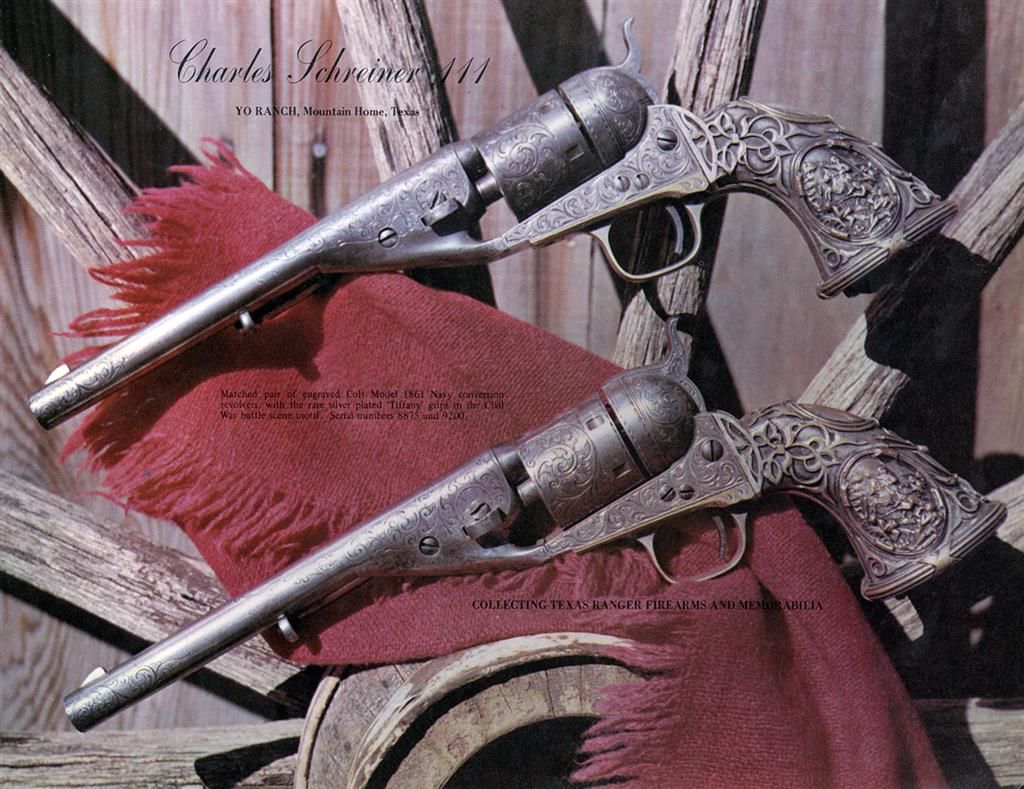 This is an extraordinary example of a Tiffany Gripped Factory Engraved Colt Model 1861 Navy conversion revolver. The revolver was factory converted by Colt to caliber 38CF Richards-Mason c. 1872-1874 and fitted with the rare "Civil War Battle Scene" Tiffany grip with "American Eagle" buttcap. This revolver is illustrated on page 295 of "THE COLT ENGRAVING BOOK, VOLUME ONE" by R,L Wilson and pictured and described in detail on pages 256-257 of "A STUDY OF COLT CONVERSIONS" by R. Bruce McDowell. Bruce McDowell describes the revolver as the most often photographed and most valuable Tiffany gripped Colt Model 1861 factory-engraved revolver. The revolver barrel lug, muzzle, ejector housing, cylinder, frame, and trigger guard are decorated with Gustave Young's Germanic scroll-work on a punch-dot background. The conversion ring and loading gate are engraved with scalloped and double-line borders. The sides of the hammer are engraved with Young's signature wolf's head motif. McDowell notes that engraving on the recoil shield was carefully redone to match the original percussion engraving. The barrel lug and trigger guard have the punch-mark above or below the serial number which indicates that the components were designated by the Colt factory for engraving. The Tiffany grips have highly detailed, relief-cast, Civil War battle scenes in oval panels on the sides, an escutcheon and stand of arms with United States shield on the back and relief-cast eagle on the butt. The top of the barrel is roll-stamped with the legend: "-ADDRESS COL. SAML COLT NEW-YORK U.S. AMERICA-". The full serial number, "8875" is stamped on the bottom of the barrel lug, frame and trigger guard. The assembly number "844" is stamped on the inside of the loading gate. The revolver has a .38 centerfire hammer with bordered knurling on the spur, round ejector rod tip, ejector rod with concentric rings and loading gate with external spring. This revolver was originally one of a matched pair and is illustrated in both the Wilson and McDowell books with an identical Tiffany grip Model 1861 Richards-Mason conversion serial number 9200. This revolver may be the best documented factory engraved Colt Model 1861 Navy Richards-Mason conversion revolver with Tiffany grips extant.