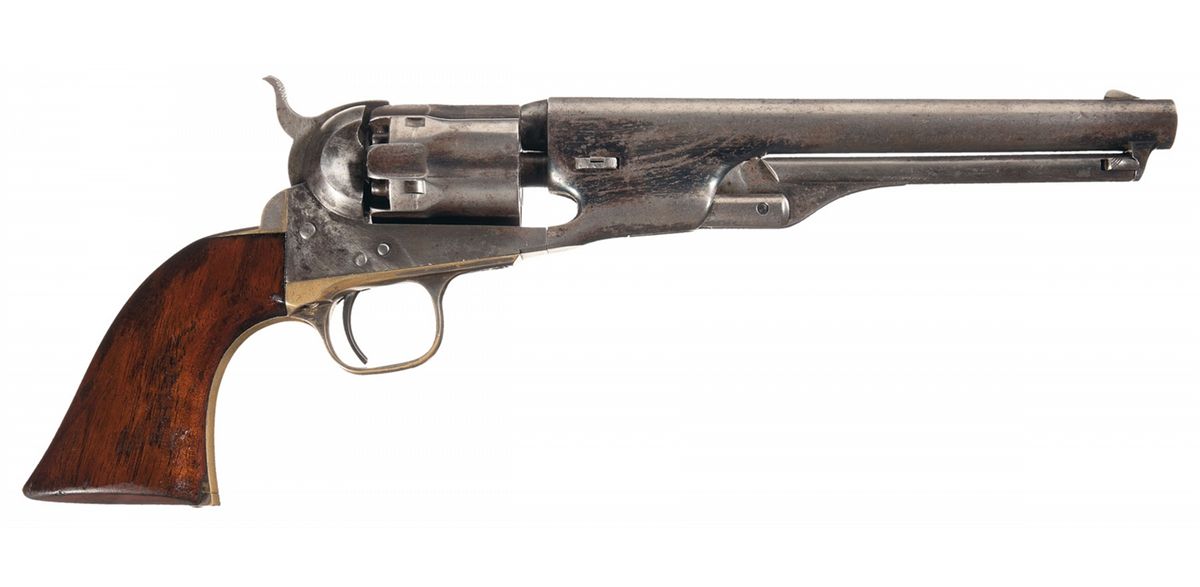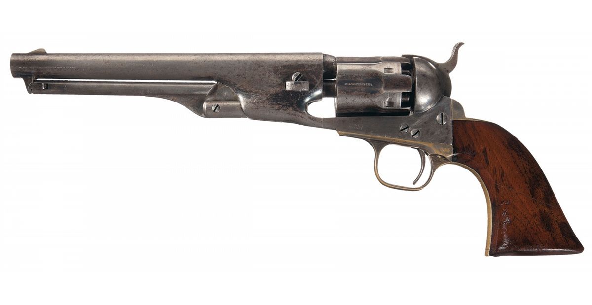 Condition: Fine. The barrel and cylinder retain 30% original blue finish in protected areas with a smooth silver-gray patina on the balance. The loading lever, frame and hammer have a silver-gray patina with traces of the original case colors in protected areas. The trigger guard and back strap retain 40% of the original silver plating. The inscriptions on the back strap and butt are crisp. There is some minor flash pitting on the sides of the hammer and cylinder faces. The grip is fine with 90% of the original varnish remaining with a small chip in the right toe, some wear on the lower edges and overall some minor handling marks. The markings remain sharp. The action is tight and functions perfectly. This is a fine example of a rarely encountered variation of the Model 1861 Navy Revolver with original Civil War inscriptions that identifies it as the weapon carried by a Pennsylvania Officer for most of the Civil War. This is a rare and historic fluted cylinder Colt Model 1861 Navy revolver.