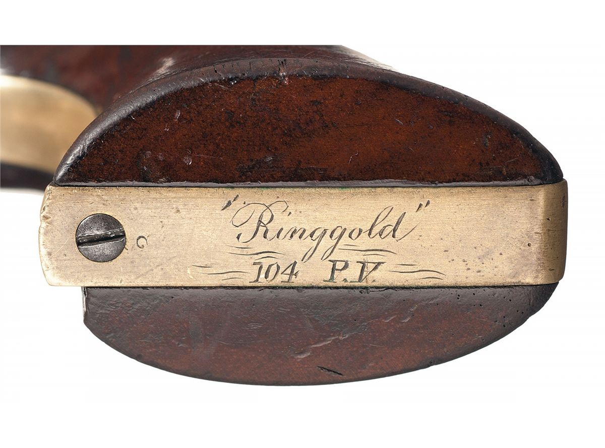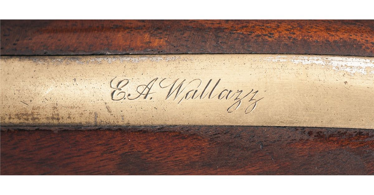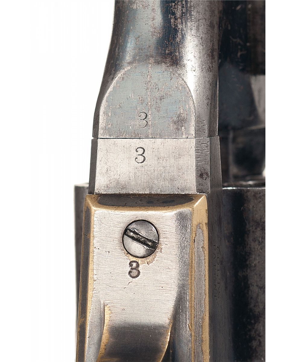 This is an extremely rare example of one of the very first Colt Model 1861 Navy fluted cylinder revolvers with serial number 3. Only about 100 Model 1861 Navy revolvers were manufactured with fluted cylinders ( No. 11 and No. 30 are pictured on pages 167 and 168 of The Book of Colt Firearms by R.L. Wilson). The back strap of this revolver is inscribed "E.A. WALLAZZ" and the butt is inscribed "Ringgold/104 P.V.". Extensive copies of service records that accompany the revolver indicate that Edward A. Wallazz enlisted in Company A, 104th Pennsylvania, Volunteer Infantry for three years on September 6, 1861 at Doylestown, Pennsylvania. Wallazz was promoted to Sergeant Major on October 11, 1861 and was promoted to 1st Lieutenant and Regimental Adjutant in 1862. Lieutenant Wallazz mustered out of the service in September 1864. The 104th Pennsylvania Infantry fought in the Seven Days Battles in May and June 1862. From January 1863 until September 1864 the regiment was assigned to 18th Army Corps Department of North Carolina and participated on the Carolina coast. The 104th Pennsylvania Infantry lost 2 officers and 68 enlisted men (killed in action) and 115 men from disease between 1861 and 1865. The top of the barrel is marked with the one-line legend "- ADDRESS COL. SAML COLT NEW-YORK U.S. AMERICA-". "COLTS/PATENT" is stamped on the left side of the frame and "PATENT SEPT10th 1860" is stamped in one cylinder flute. An "L" Colt inspection mark is stamped on the left shoulder of the trigger guard, "C" and * are stamped on the front face of the cylinder and "M" is stamped on the rear face. The number "2" is stamped on the underside of the barrel just in front of the loading lever cut-out. The serial number, "3", is stamped on the underside of the wedge, the bottom of the barrel lug, on the cylinder arbor pin, frame, trigger guard, back strap and on the rear face of the cylinder. The barrel and cylinder were blue, casehardened frame and hammer, with silver plated brass back strap and trigger guard. Blade front and hammer notch rear sights, and fitted with a smooth one-piece varnished walnut grip.