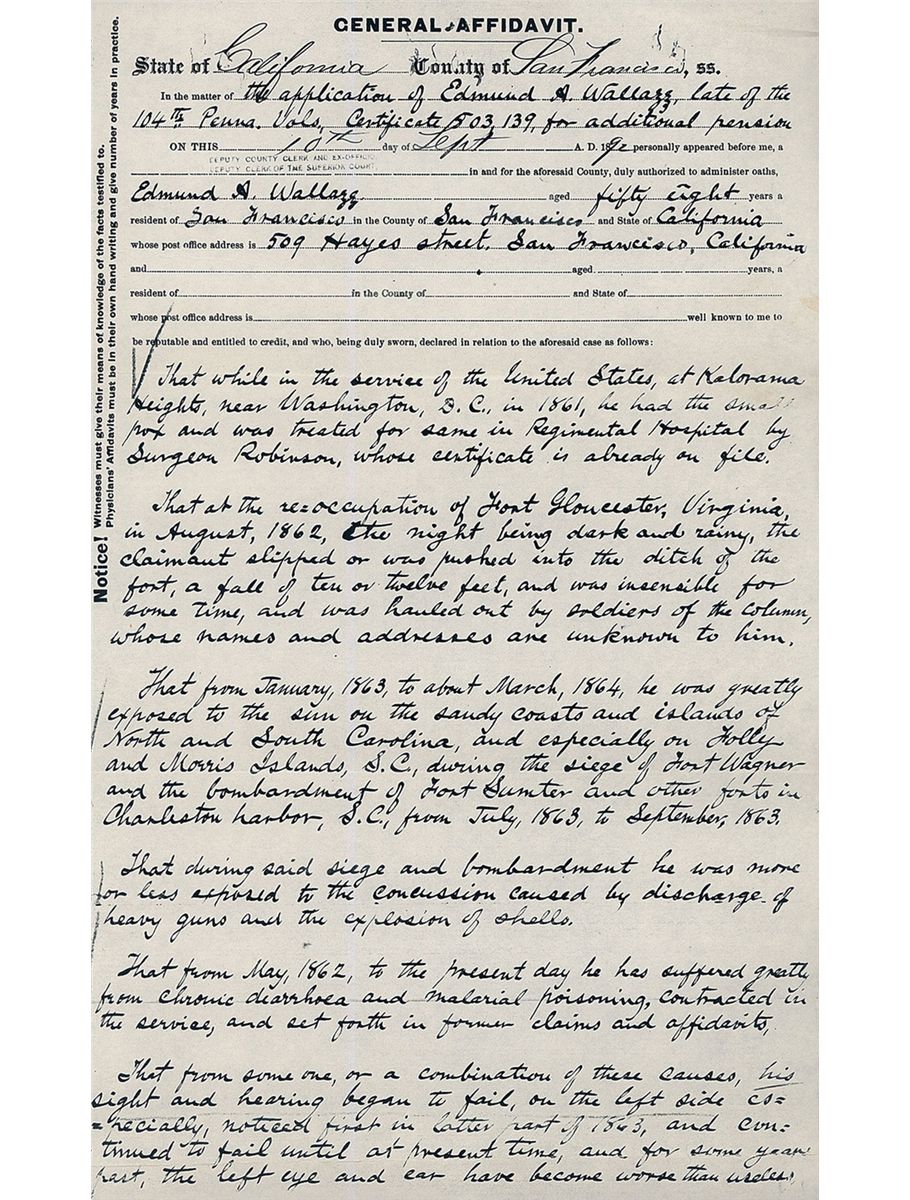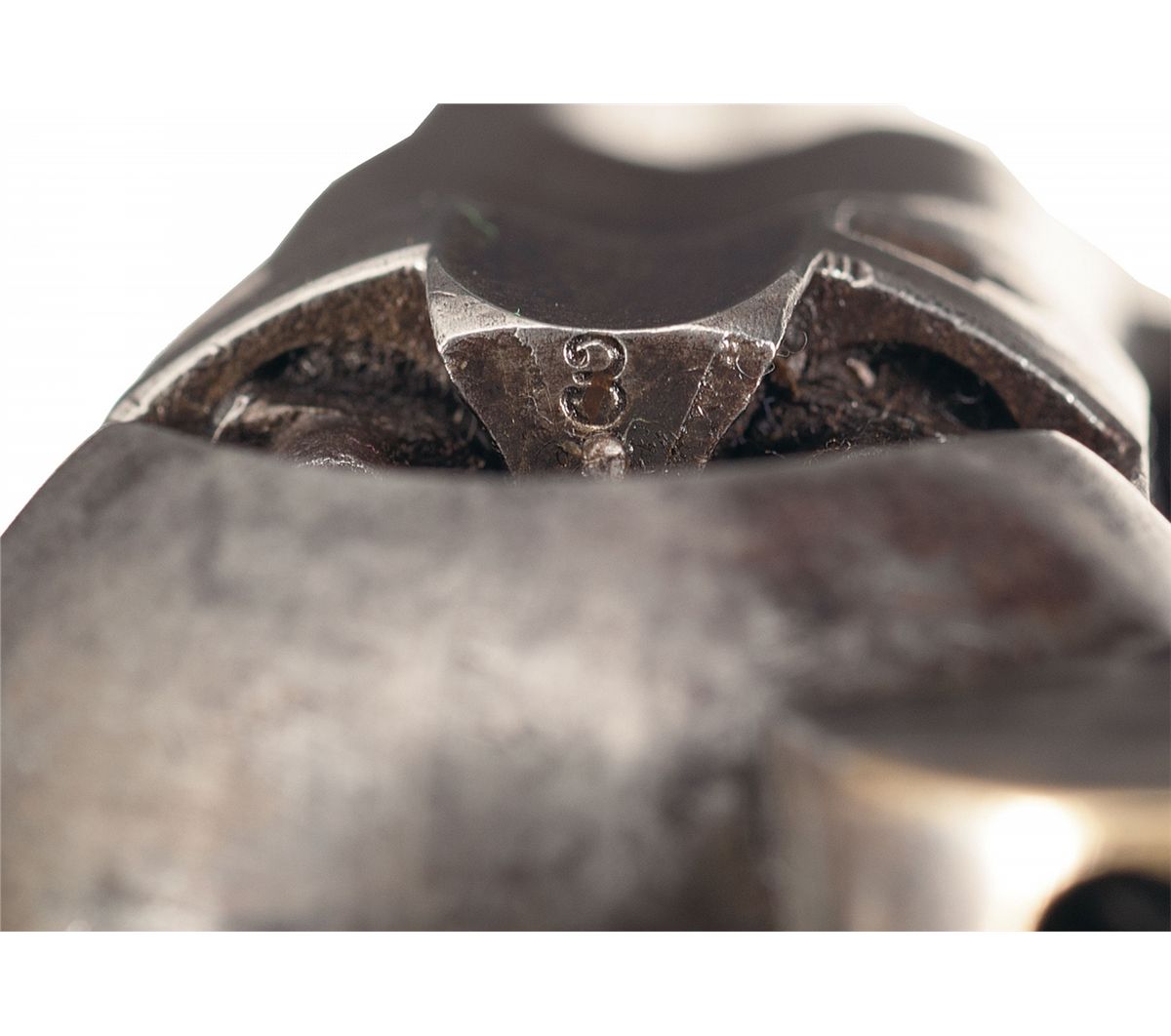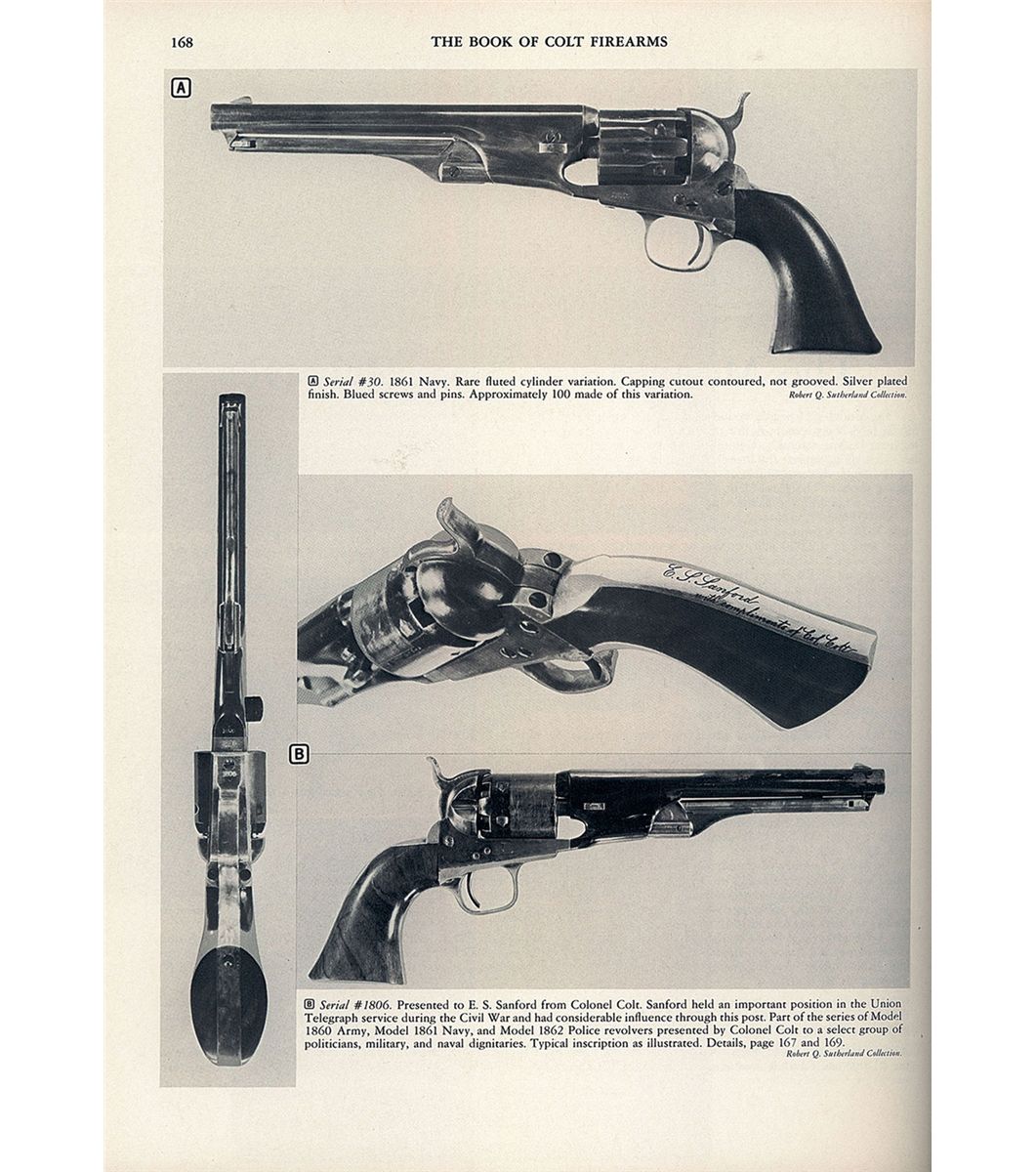 This is an extremely rare example of one of the very first Colt Model 1861 Navy fluted cylinder revolvers with serial number 3. Only about 100 Model 1861 Navy revolvers were manufactured with fluted cylinders ( No. 11 and No. 30 are pictured on pages 167 and 168 of The Book of Colt Firearms by R.L. Wilson). The back strap of this revolver is inscribed "E.A. WALLAZZ" and the butt is inscribed "Ringgold/104 P.V.". Extensive copies of service records that accompany the revolver indicate that Edward A. Wallazz enlisted in Company A, 104th Pennsylvania, Volunteer Infantry for three years on September 6, 1861 at Doylestown, Pennsylvania. Wallazz was promoted to Sergeant Major on October 11, 1861 and was promoted to 1st Lieutenant and Regimental Adjutant in 1862. Lieutenant Wallazz mustered out of the service in September 1864. The 104th Pennsylvania Infantry fought in the Seven Days Battles in May and June 1862. From January 1863 until September 1864 the regiment was assigned to 18th Army Corps Department of North Carolina and participated on the Carolina coast. The 104th Pennsylvania Infantry lost 2 officers and 68 enlisted men (killed in action) and 115 men from disease between 1861 and 1865. The top of the barrel is marked with the one-line legend "- ADDRESS COL. SAML COLT NEW-YORK U.S. AMERICA-". "COLTS/PATENT" is stamped on the left side of the frame and "PATENT SEPT10th 1860" is stamped in one cylinder flute. An "L" Colt inspection mark is stamped on the left shoulder of the trigger guard, "C" and * are stamped on the front face of the cylinder and "M" is stamped on the rear face. The number "2" is stamped on the underside of the barrel just in front of the loading lever cut-out. The serial number, "3", is stamped on the underside of the wedge, the bottom of the barrel lug, on the cylinder arbor pin, frame, trigger guard, back strap and on the rear face of the cylinder. The barrel and cylinder were blue, casehardened frame and hammer, with silver plated brass back strap and trigger guard. Blade front and hammer notch rear sights, and fitted with a smooth one-piece varnished walnut grip.