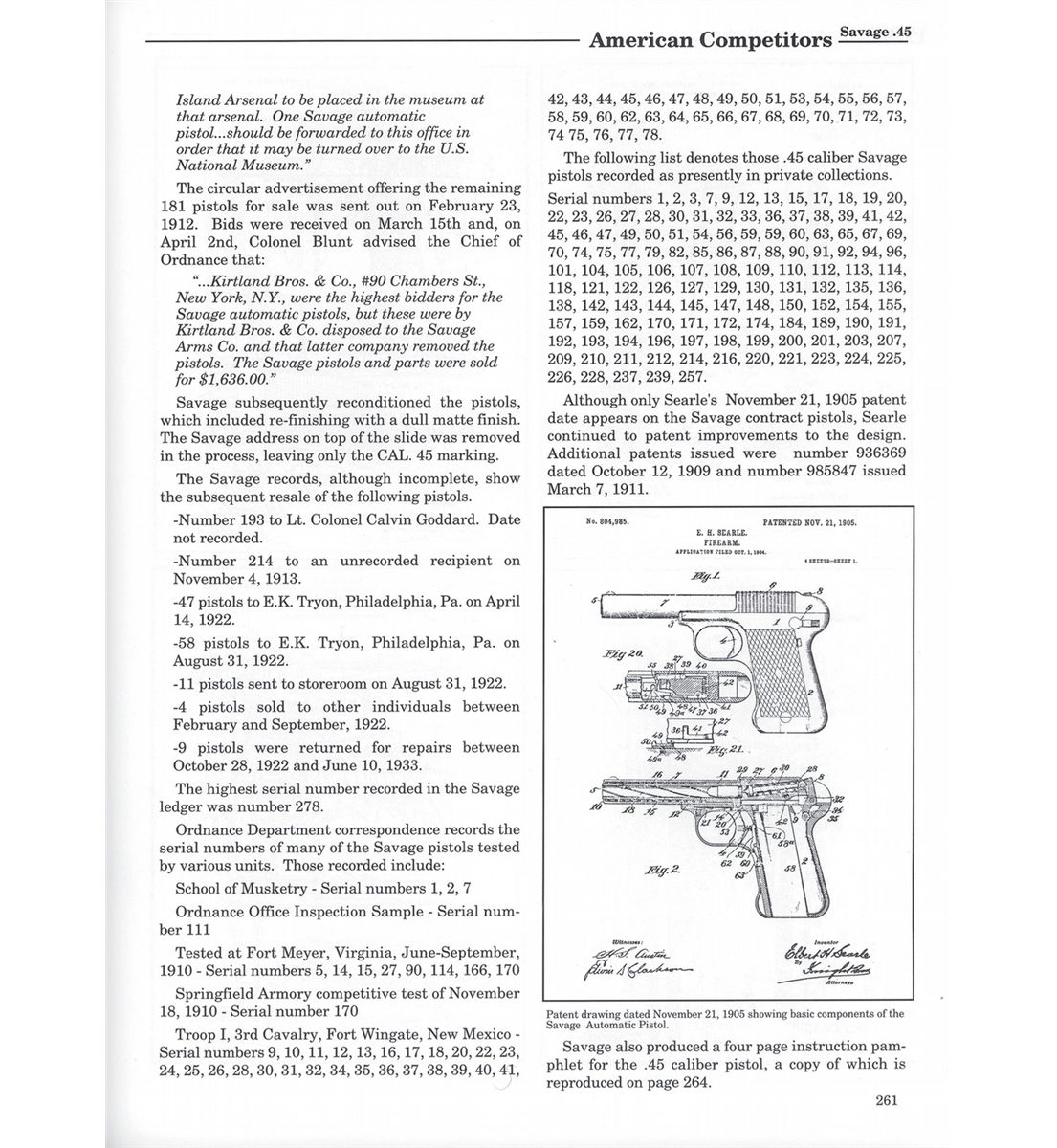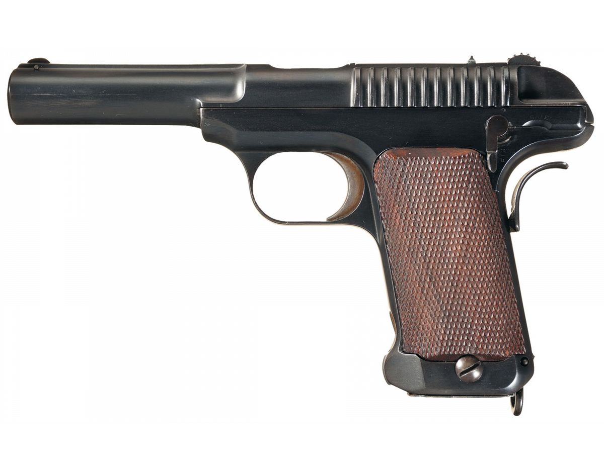 Manufactured in 1908, Savage made a total of only 288 45 caliber pistols for competitive tests and troop trials conducted between 1907 and 1911. This pistol, serial number 74, is listed in "U.S. MILITARY AUTOMATIC PISTOLS" by Edward S. Meadows as being issued to Troop I, 3rd Cavalry Regiment at Ft. Wingate, New Mexico. The troop trials and competitive tests conducted by the Ordnance Department tests ultimately resulted in the selection of the Colt .45 Automatic as the Army service pistol. Savage reconditioned and refinished the trials pistols and most of the reconditioned pistols were eventually sold to E.K. Tryon of Philadelphia. The pistol has a dull blue finish with bright barrel and trigger and is fitted with checkered walnut grips. The eight-shot magazine has a full blue finish. The barrel is marked "CAL. 45" on the rib. The Savage legend that was originally marked on the rib was removed when the pistol was reconditioned. The serial number is stamped on the underside of the slide. The left side of the frame has the "SAFE" and "FIRE" markings that were added to pistols from the 3rd Cavalry that were returned to Savage for repair in 1909. The magazine spine is stamped with the serial number "86". The pistol has the distinctive ribbed hammer and folding lanyard loop. The Savage Military Model 1907 Trials pistol is a rare and historic military pistol that would be a key addition to any advanced U.S. military handgun collection.