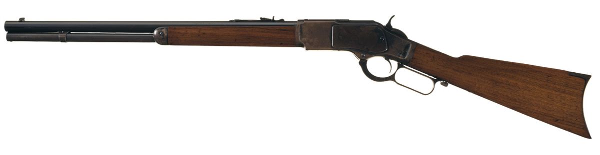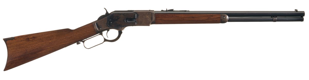 This is a rare example of a Winchester Model 1873 Short Rifle with special order 20-inch barrel. The rifle is accompanied by a letter from the Cody Firearms Museum that describes the features as "Rifle, 44 caliber, Barrel Length: 20 inches, Barrel Shape: Round Sights: New 22A Sight". The letter further states that this rifle was shipped from the Winchester warehouse on March 28, 1918. The rifle has a full blue finish with straight grain, varnished American walnut stock and forearm. The stock has a crescent steel buttplate with sliding brass trap. The butttrap contains a three-piece jointed steel cleaning rod. The special order front sight has a screw-adjustable base with blued steel blade and replacement silver bead. The rear sight is a standard sporting style sight with flat top. The upper tang is factory drilled and tapped for a rear sight. The left side of the barrel is roll-stamped "WINCHESTER'S REPEATING ARMS. NEW HAVEN. CT./KING'S IMPROVEMENT PATENTED MARCH 29. 1866. OCTOBER 16. 1860." in two lines ahead of the rear sight. "44 W.C.F." is roll-stamped on the left side of the barrel between the rear sight and the receiver. Winchester oval "W/P" proof marks are stamped on the top of the barrel and receiver. "44 CAL" is stamped in script letters on the bottom of the cartridge elevator. The upper receiver tang is roll-stamped "MODEl 1873/-WINCHESTER-/TRADE MARK REG. IN U.S. PAT.OFF." in three lines. The serial number "716449 B" in stamped in block numerals on the lower tang between the lever latch and the tang screw. Winchester Model 1873 Short Rifles are extremely scarce. The survey of surviving Model 1873 rifles in WINCHESTER'S NEW MODEL RIFLE OF 1873, A TRIBUTE by James B. Gordon, lists only 79 rifles with 20-inch barrel in the 3,847 guns surveyed.