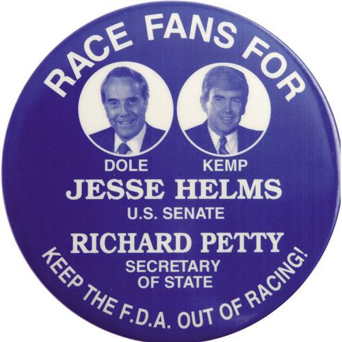 <B>Rare Dole, Kemp, Helms, Petty Button.</B></I> A large 3" 1996 pinback from North Carolina featuring portraits of Bob Dole and Jack Kemp above type espousing Jesse Helms for U.S. Senator and racing legend Richard Petty for North Carolina Secretary of State. The button, appealing to NASCAR fans, urges the voter to "Keep the F.D.A. Out of Racing!" This pin was manufactured by Bobby May in a limited quantity of perhaps 50-100. A tough variety in fine condition.