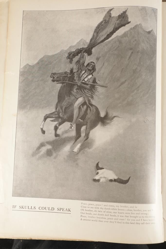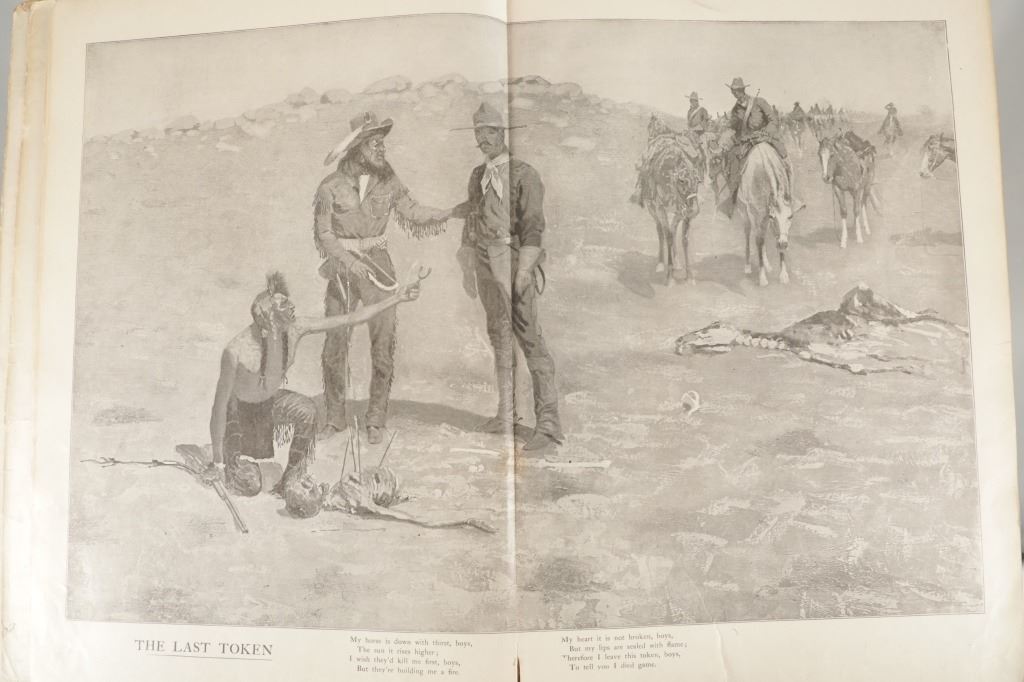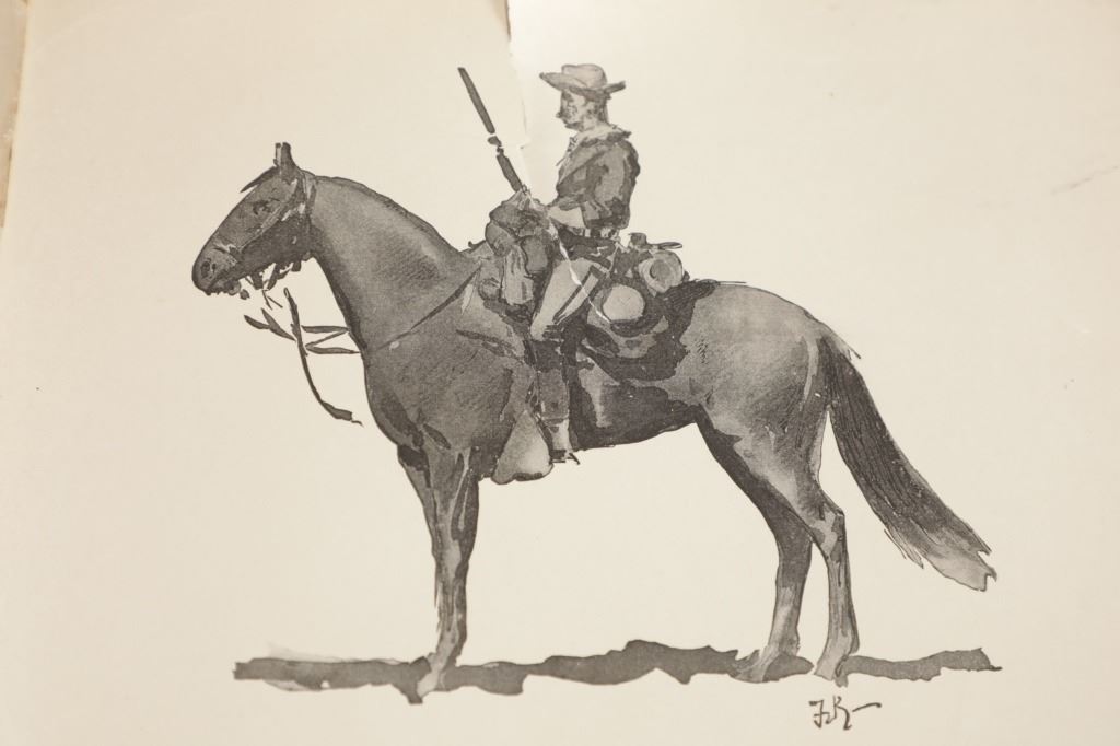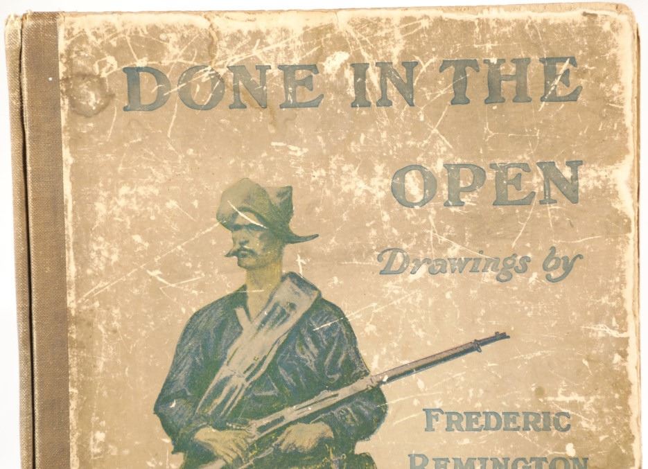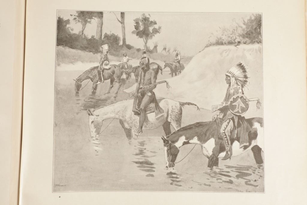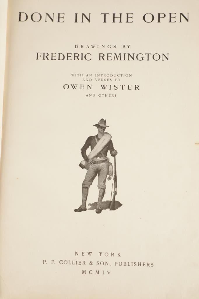 Presented in this lot is the Rare "Done in the Open, Drawings by Frederick Remington", 1902 copyright Robert Howard Russell, P. F. Collier & Son Publisher, New York. "Done In The Open drawings by Frederic Remington with an introduction and verses by Owen Wister and others" is a fascinating, early 20th-century collection of outdoor sketches by Frederic Remington and a verse collection published by American author Owen Wister. The book contains 72 Frederic Remington art pieces with a few in color. The piece shows 12 double page drawings, 28 full page drawings, and 32 smaller drawings. Each of the drawings is accompanied by the art’s title and a verse or poem about the piece. The book was a collaboration with the artist, Frederic Sackrider Remington, the verses being written to accompany Remington's drawings. Remington was an American painter, illustrator, sculptor, and writer who specialized in the genre of Western American Art. His works are known for depicting the Western United States in the last quarter of the 19th century and featuring such images as cowboys, American Indians, and the US Cavalry. Remington's collaboration with Wister on The Evolution of the Cowpuncher, published by Harper's Monthly in September 1893, was the first statement of the mythical cowboy in American literature, spawning the entire genre of Western fiction, films, and theater that followed. Remington provided the concept of the project, its factual content, and its illustrations and Wister supplied the stories, sometimes altering Remington's ideas. Remington's prototype cowboys were Mexican rancheros but Wister made the American cowboys descendants of Saxons. In truth, they were both partially right, as the first American cowboys were both the ranchers who tended the cattle and horses of the American Revolutionary Army on Long Island and the Mexicans who ranched in the Arizona and California territories. Remington was one of the first American artists to illustrate the true gait of the horse in motion (along with Thomas Eakins), The galloping horse became Remington's signature subject, which was copied and interpreted by many Western artists who followed him to adopt the correct anatomical motion. Though criticized by some for his use of photography, Remington often created depictions that slightly exaggerated natural motion to satisfy the eye. He wrote that "the artist must know more than the camera... (the horse must be) incorrectly drawn from the photographic standpoint (to achieve the desired effect). Also, noteworthy was Remington's invention of "cowboy" sculpture. From his inaugural piece, "The Bronco Buster", he created an art form which is still very popular among collectors of Western art. He has been called the "Father of Cowboy Sculpture." This Cream-colored boards hardcover is in fair overall condition, the front cover decorated with the Remington portrait, "Infantry Soldier", a cloth backstrip on the spine. Inside pages are free of writing and intentional marks. Intact pages exhibit age tanning, tears. Covers and spine are dirty. Quite a bit of edge wear is evident, including crushed spine ends and exposed board at corners. Inner hinge is cracked and a little loose. Some interior gutters are cracked. Inside pages exhibit occasional edge wear. Measures 11.5"W x 16.5"L x .5"D.
