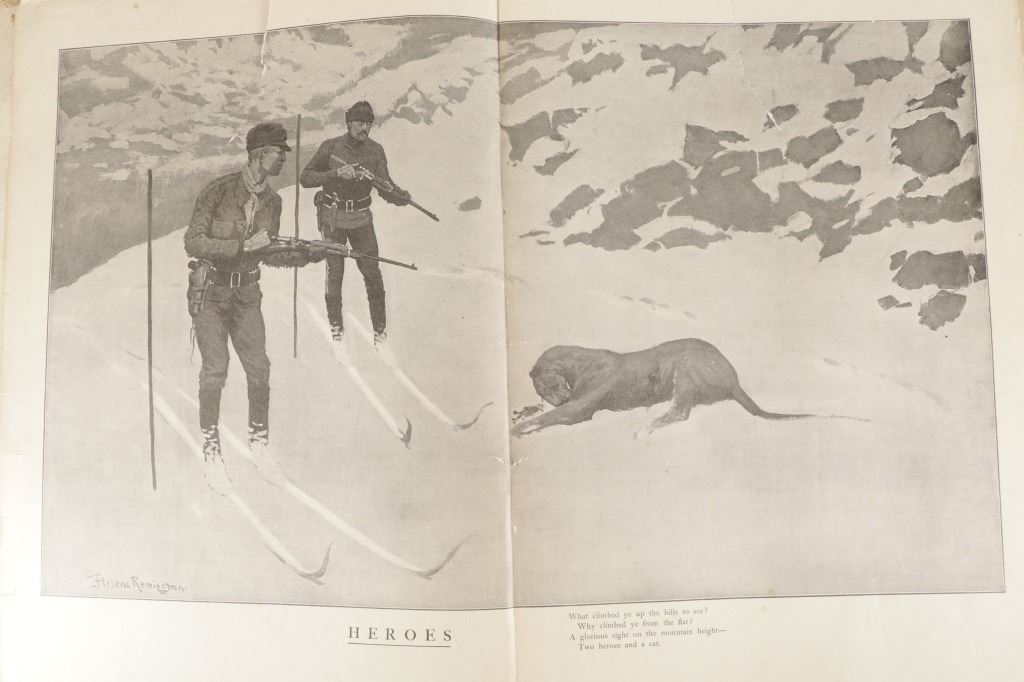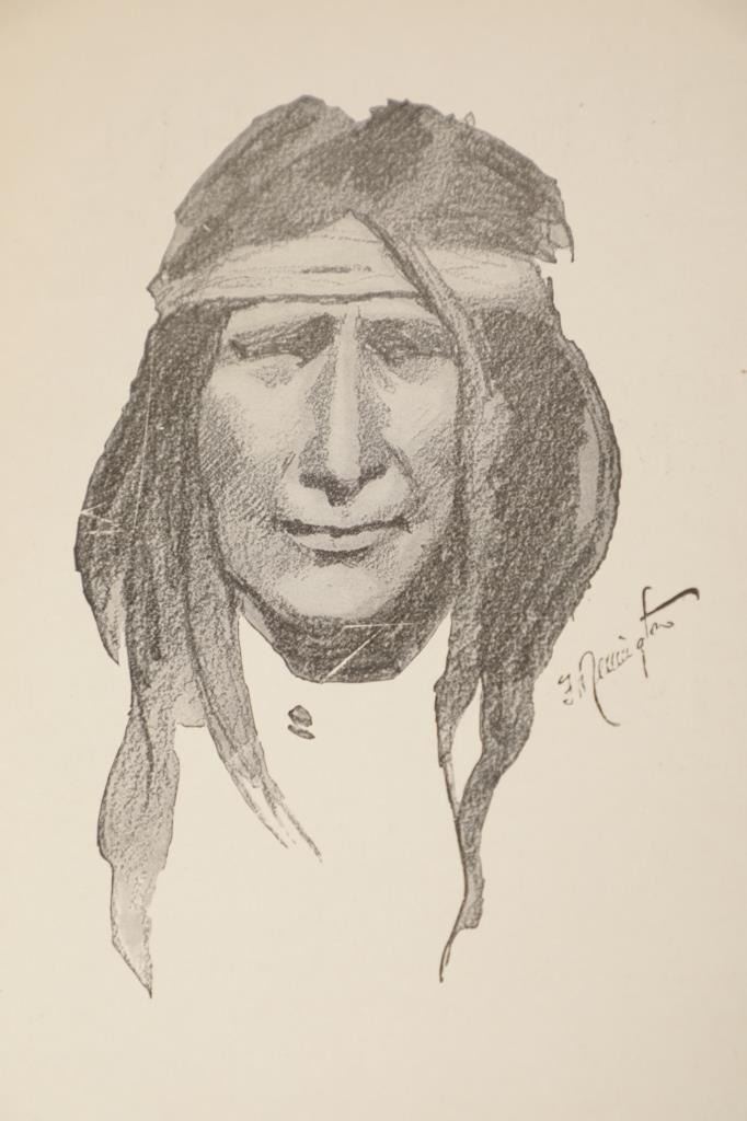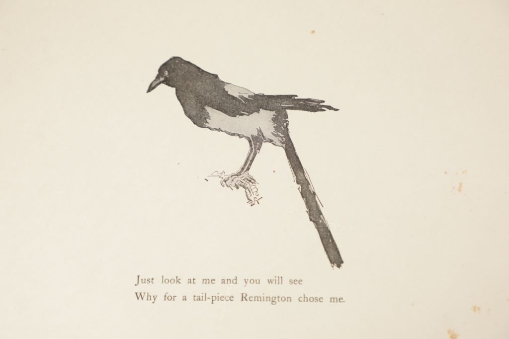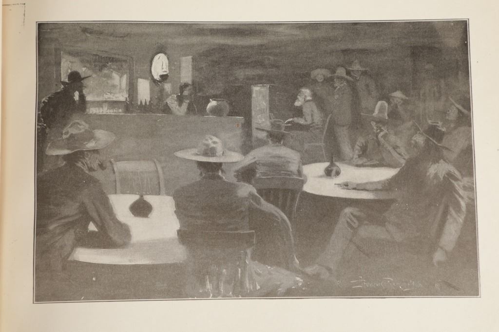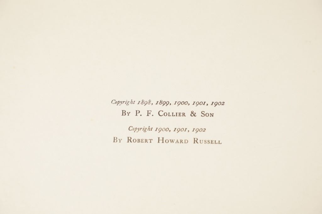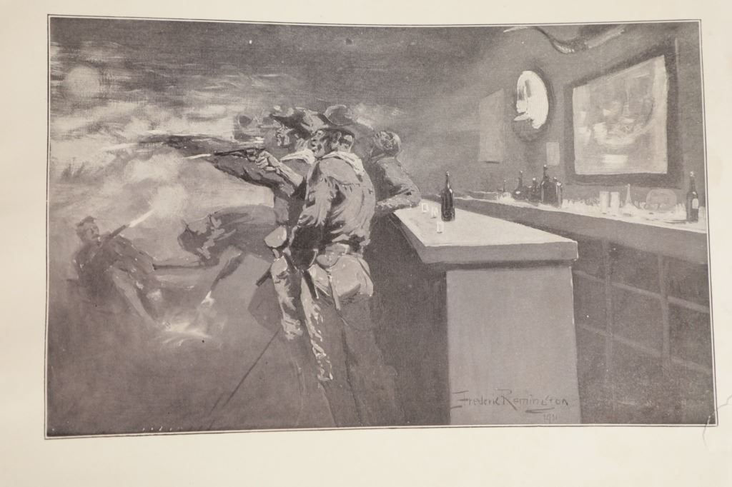 Presented in this lot is the Rare "Done in the Open, Drawings by Frederick Remington", 1902 copyright Robert Howard Russell, P. F. Collier & Son Publisher, New York. "Done In The Open drawings by Frederic Remington with an introduction and verses by Owen Wister and others" is a fascinating, early 20th-century collection of outdoor sketches by Frederic Remington and a verse collection published by American author Owen Wister. The book contains 72 Frederic Remington art pieces with a few in color. The piece shows 12 double page drawings, 28 full page drawings, and 32 smaller drawings. Each of the drawings is accompanied by the art’s title and a verse or poem about the piece. The book was a collaboration with the artist, Frederic Sackrider Remington, the verses being written to accompany Remington's drawings. Remington was an American painter, illustrator, sculptor, and writer who specialized in the genre of Western American Art. His works are known for depicting the Western United States in the last quarter of the 19th century and featuring such images as cowboys, American Indians, and the US Cavalry. Remington's collaboration with Wister on The Evolution of the Cowpuncher, published by Harper's Monthly in September 1893, was the first statement of the mythical cowboy in American literature, spawning the entire genre of Western fiction, films, and theater that followed. Remington provided the concept of the project, its factual content, and its illustrations and Wister supplied the stories, sometimes altering Remington's ideas. Remington's prototype cowboys were Mexican rancheros but Wister made the American cowboys descendants of Saxons. In truth, they were both partially right, as the first American cowboys were both the ranchers who tended the cattle and horses of the American Revolutionary Army on Long Island and the Mexicans who ranched in the Arizona and California territories. Remington was one of the first American artists to illustrate the true gait of the horse in motion (along with Thomas Eakins), The galloping horse became Remington's signature subject, which was copied and interpreted by many Western artists who followed him to adopt the correct anatomical motion. Though criticized by some for his use of photography, Remington often created depictions that slightly exaggerated natural motion to satisfy the eye. He wrote that "the artist must know more than the camera... (the horse must be) incorrectly drawn from the photographic standpoint (to achieve the desired effect). Also, noteworthy was Remington's invention of "cowboy" sculpture. From his inaugural piece, "The Bronco Buster", he created an art form which is still very popular among collectors of Western art. He has been called the "Father of Cowboy Sculpture." This Cream-colored boards hardcover is in fair overall condition, the front cover decorated with the Remington portrait, "Infantry Soldier", a cloth backstrip on the spine. Inside pages are free of writing and intentional marks. Intact pages exhibit age tanning, tears. Covers and spine are dirty. Quite a bit of edge wear is evident, including crushed spine ends and exposed board at corners. Inner hinge is cracked and a little loose. Some interior gutters are cracked. Inside pages exhibit occasional edge wear. Measures 11.5"W x 16.5"L x .5"D.