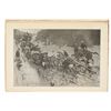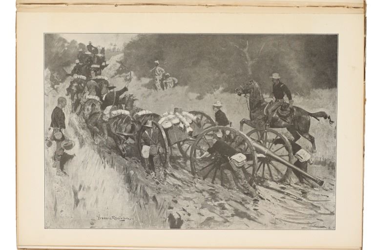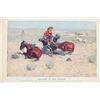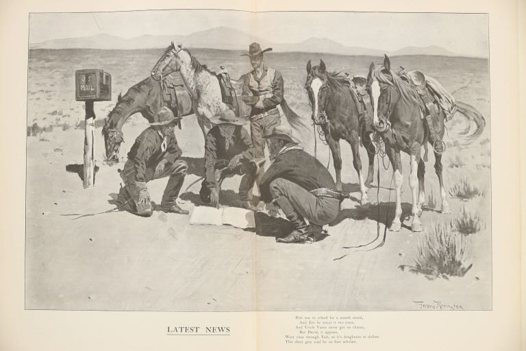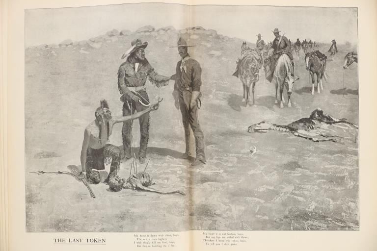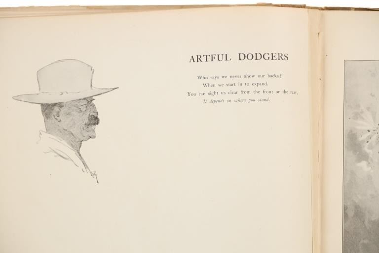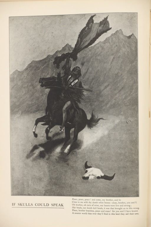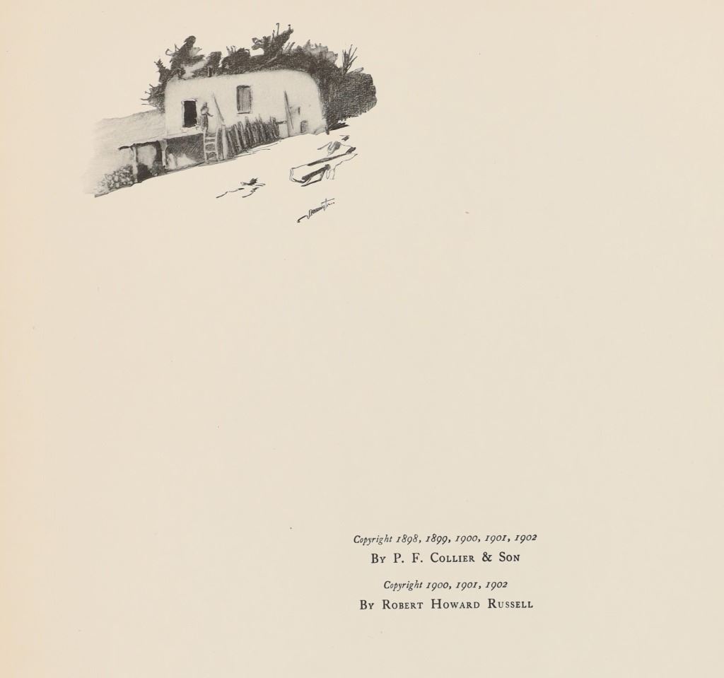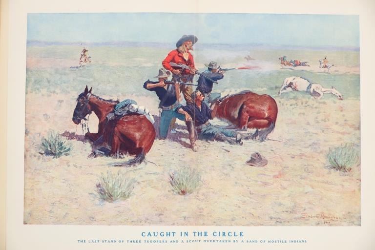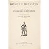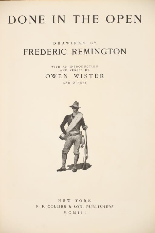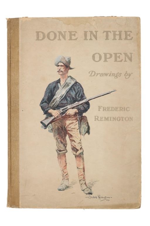 Presented in this lot is a Rare First Edition "Done in the Open, Drawings by Frederick Remington," 1902 copyright Robert Howard Russell, P. F. Collier & Son Publisher, New York. "Done In The Open drawings by Frederic Remington with an introduction and verses Owen Wister and others" is a fascinating, early 20th-century collection of outdoor sketches by Frederic Remington and a verse collection published by American author Owen Wister. The book contains 72 Frederic Remington art pieces with a few in color. The piece shows 12 double page drawings, 28 full page drawings, and 32 smaller drawings. Each of the drawings is accompanied by the art’s title and a verse or poem about the piece. The book was a collaboration with the artist, Frederic Sackrider Remington, the verses being written to accompany Remington's drawings. Remington was an American painter, illustrator, sculptor, and writer who specialized in the genre of Western American Art. His works are known for depicting the Western United States in the last quarter of the 19th century and featuring such images as cowboys, American Indians, and the US Cavalry. Remington's collaboration with Wister on The Evolution of the Cowpuncher, published by Harper's Monthly in September 1893, was the first statement of the mythical cowboy in American literature, spawning the entire genre of Western fiction, films, and theater that followed. Remington provided the concept of the project, its factual content, and its illustrations and Wister supplied the stories, sometimes altering Remington's ideas. Remington's prototype cowboys were Mexican rancheros, but Wister made the American cowboys descendants of Saxons. In truth, they were both partially right, as the first American cowboys were both the ranchers who tended the cattle and horses of the American Revolutionary Army on Long Island and the Mexicans who ranched in the Arizona and California territories. Remington was one of the first American artists to illustrate the true gait of the horse in motion (along with Thomas Eakins), The galloping horse became Remington's signature subject, which was copied and interpreted by many Western artists who followed him to adopt the correct anatomical motion. Though criticized by some for his use of photography, Remington often created depictions that slightly exaggerated natural motion to satisfy the eye. He wrote that "the artist must know more than the camera... (the horse must be) incorrectly drawn from the photographic standpoint (to achieve the desired effect). Also, noteworthy was Remington's invention of "cowboy" sculpture. From his inaugural piece "The Bronco Buster", he created an art form which is still very popular among collectors of Western art. He has been called the "Father of Cowboy Sculpture." This cream and black colored cloth hardcover is in fair to nice condition. The front cover decorated with the Remington portrait, "Infantry Soldier", includes a cloth back strip on the spine. Intact pages exhibit age tanning. Covers and spine exhibit some staining, edge wear noted. Inner hinge a little loose. There is evidence of spine repairs. The book measures 16.5"L x 11.5"W x .5"D, weight 3lb 4oz.*
