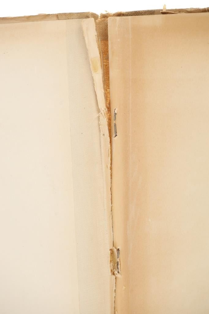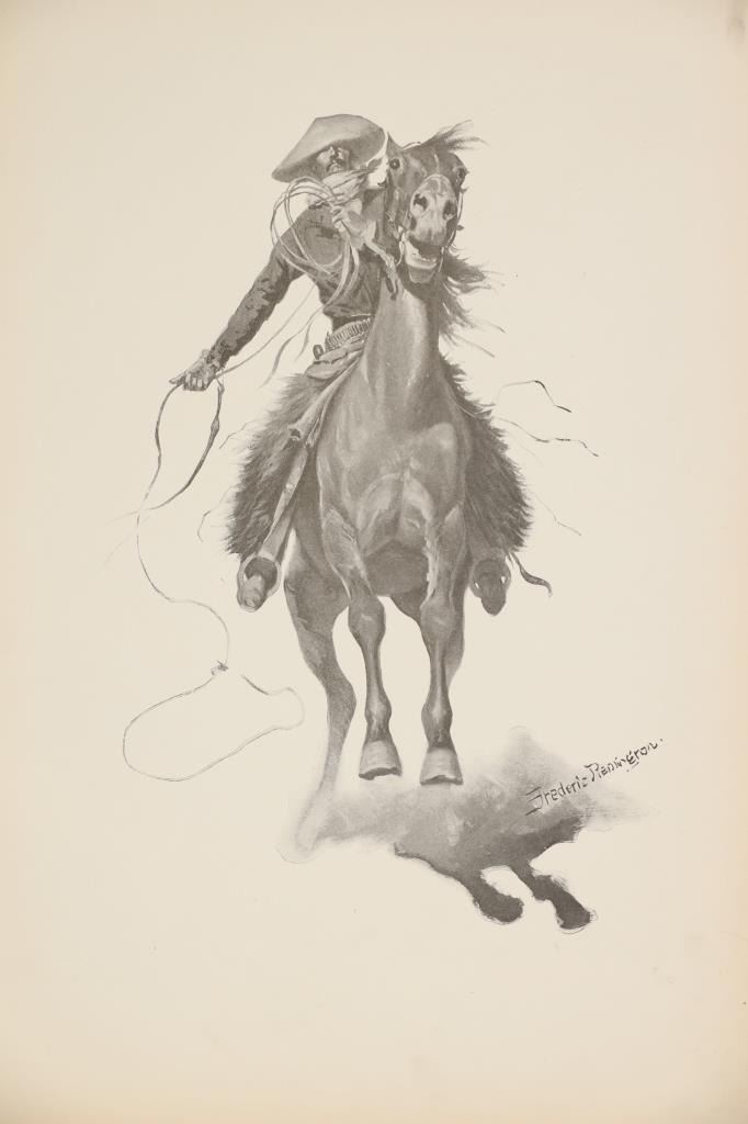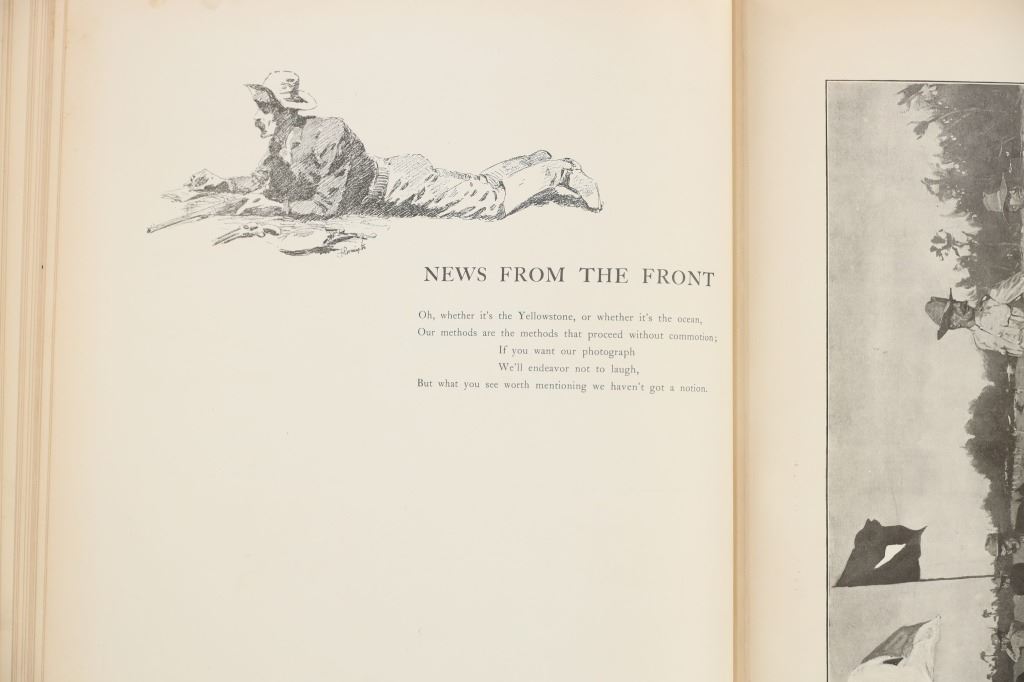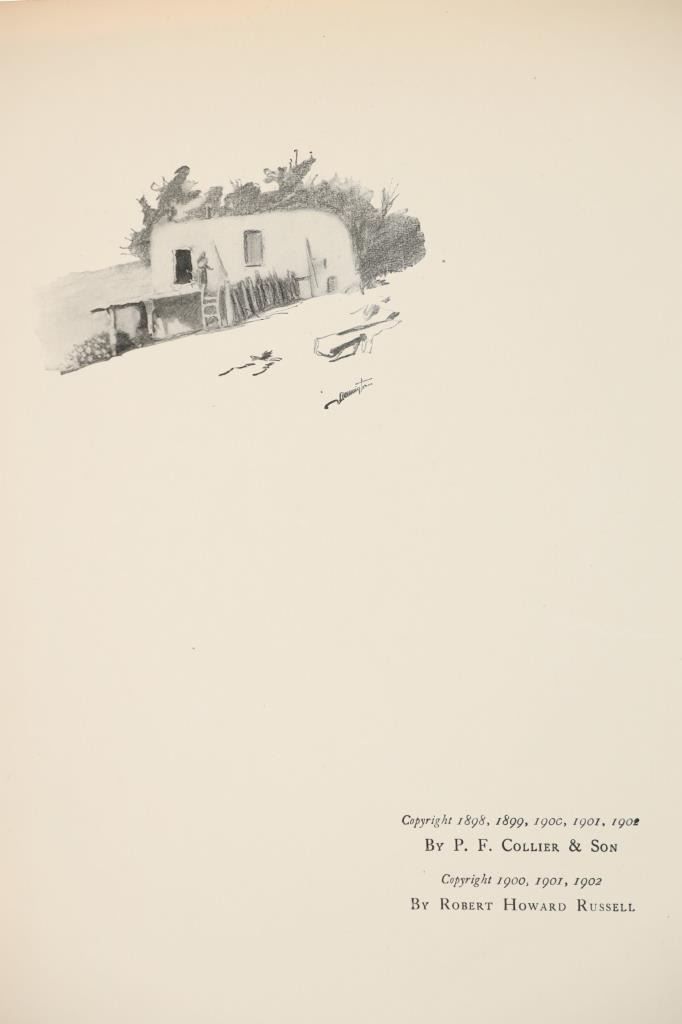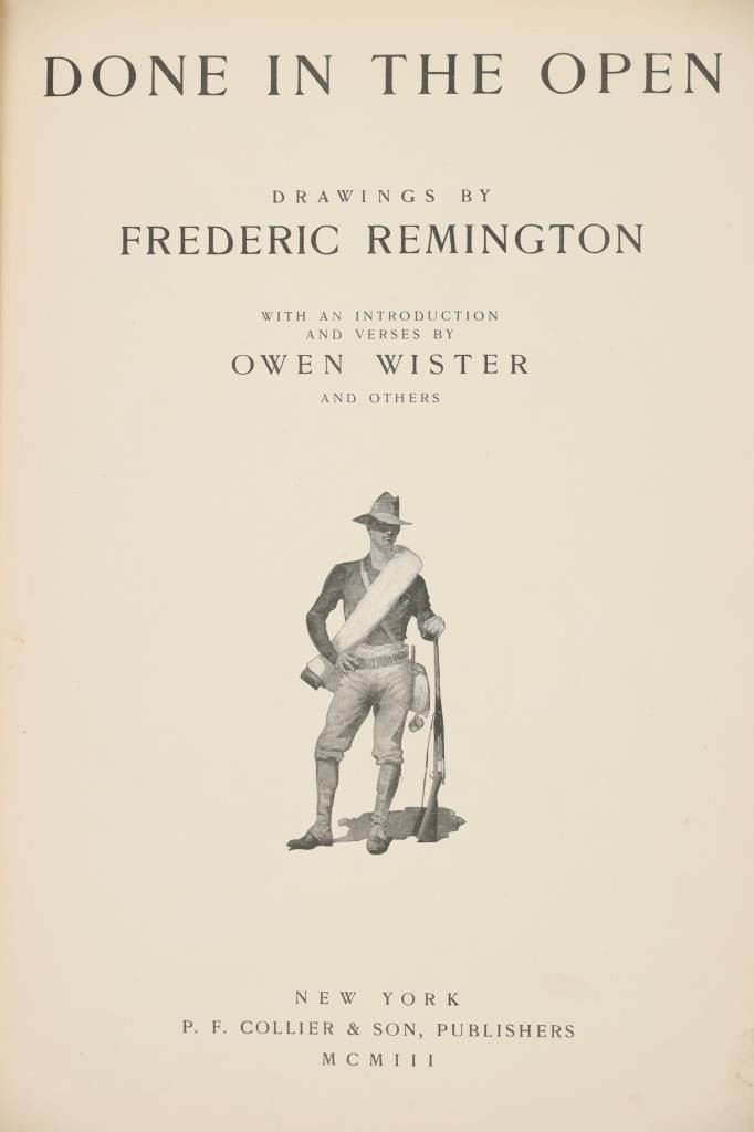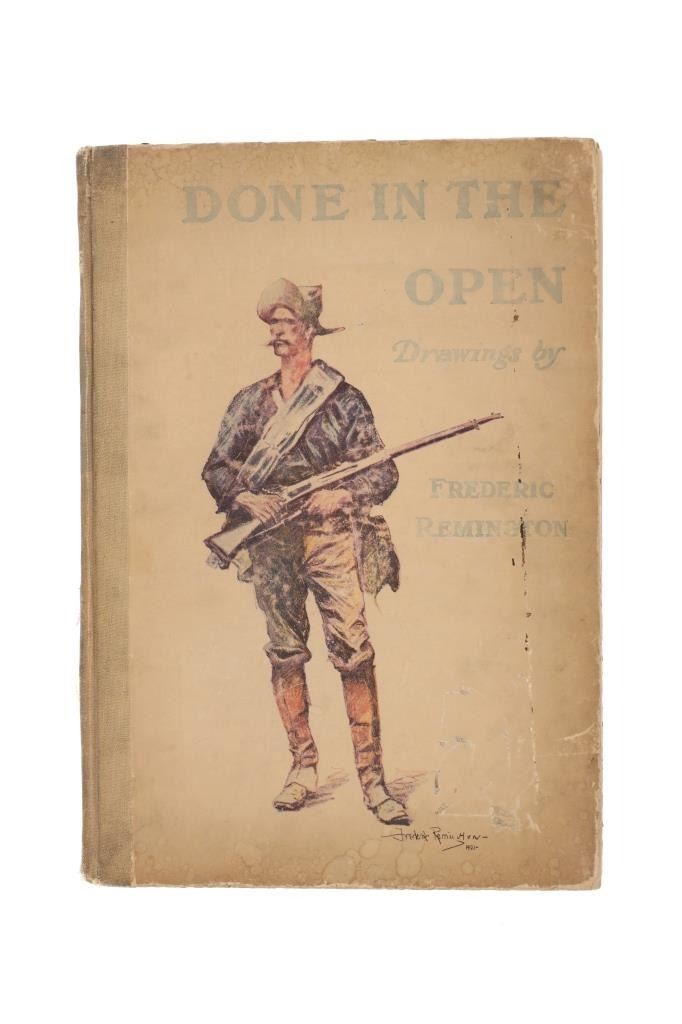 Presented in this lot is a Rare Edition "Done in the Open, Drawings by Frederick Remington," 1902 copyright Robert Howard Russell, P. F. Collier & Son Publisher, New York. "Done In The Open Drawings by Frederic Remington" with an introduction and verses Owen Wister and others, is a fascinating, early 20th-century collection of outdoor sketches by Frederic Remington and a verse collection published by American author, Owen Wister. The book contains 72 Frederic Remington art pieces with a few in color. The piece shows 12 double page drawings, 28 full page drawings, and 32 smaller drawings. Each of the drawings is accompanied by the art's title and a verse or poem about the piece. The book was a collaboration with the artist, Frederic Sackrider Remington (1861-1909), the verses being written to accompany Remington's drawings. Remington was an American painter, illustrator, sculptor, and writer who specialized in the genre of Western American Art. His works are known for depicting the Western United States in the last quarter of the 19th century and featuring such images as cowboys, American Indians, and the US Cavalry. Remington's collaboration with Wister on The Evolution of the Cowpuncher, published by Harper's Monthly in September 1893, was the first statement of the mythical cowboy in American literature, spawning the entire genre of Western fiction, films, and theater that followed. Remington provided the concept of the project, its factual content, and its illustrations and Wister supplied the stories, sometimes altering Remington's ideas. Remington's prototype cowboys were Mexican rancheros, but Wister made the American cowboys descendants of Saxons. In truth, they were both partially right, as the first American cowboys were both the ranchers who tended the cattle and horses of the American Revolutionary Army on Long Island and the Mexicans who ranched in the Arizona and California territories. Remington was one of the first American artists to illustrate the true gait of the horse in motion (along with Thomas Eakins), The galloping horse became Remington's signature subject, which was copied and interpreted by many Western artists who followed him to adopt the correct anatomical motion. Though criticized by some for his use of photography, Remington often created depictions that slightly exaggerated natural motion to satisfy the eye. He wrote that "the artist must know more than the camera... (the horse must be) incorrectly drawn from the photographic standpoint (to achieve the desired effect)." Also, noteworthy was Remington's invention of "cowboy" sculpture. From his inaugural piece, "The Bronco Buster", he created an art form which is still very popular among collectors of Western art. He has been called the "Father of Cowboy Sculpture." This cream and black colored cloth hardcover is in fair to nice condition. The front cover decorated with the Remington portrait, "Infantry Soldier", includes a cloth back strip on the spine. Intact pages exhibit age tanning. Covers and spine exhibit soiling, staining, edge wear noted. Inner hinges loose. There is evidence of spine repairs. The book measures 16.5"L x 11.5"W x .5"D; weight 3lb 4oz.*